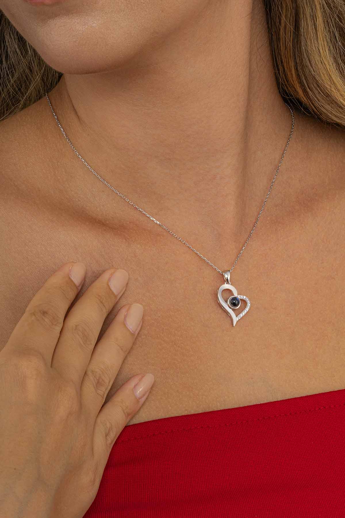 Aşkınızı en özel şekilde ifade edin! 925 ayar gümüş kalp kolye, taşının içinde 100 farklı dilde “Seni Seviyorum” yazısıyla projeksiyon şeklinde yansıtarak sevginizi büyüleyici bir detayla dile getiriyor.