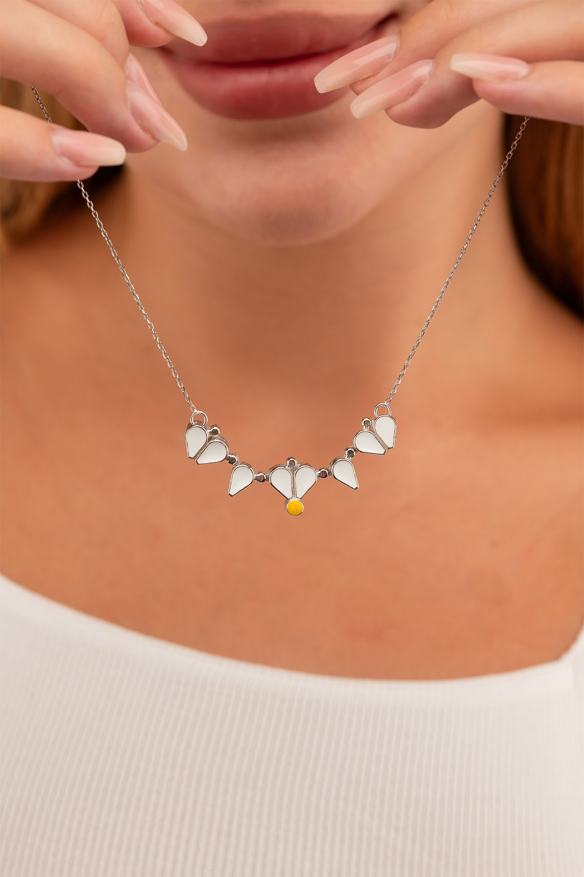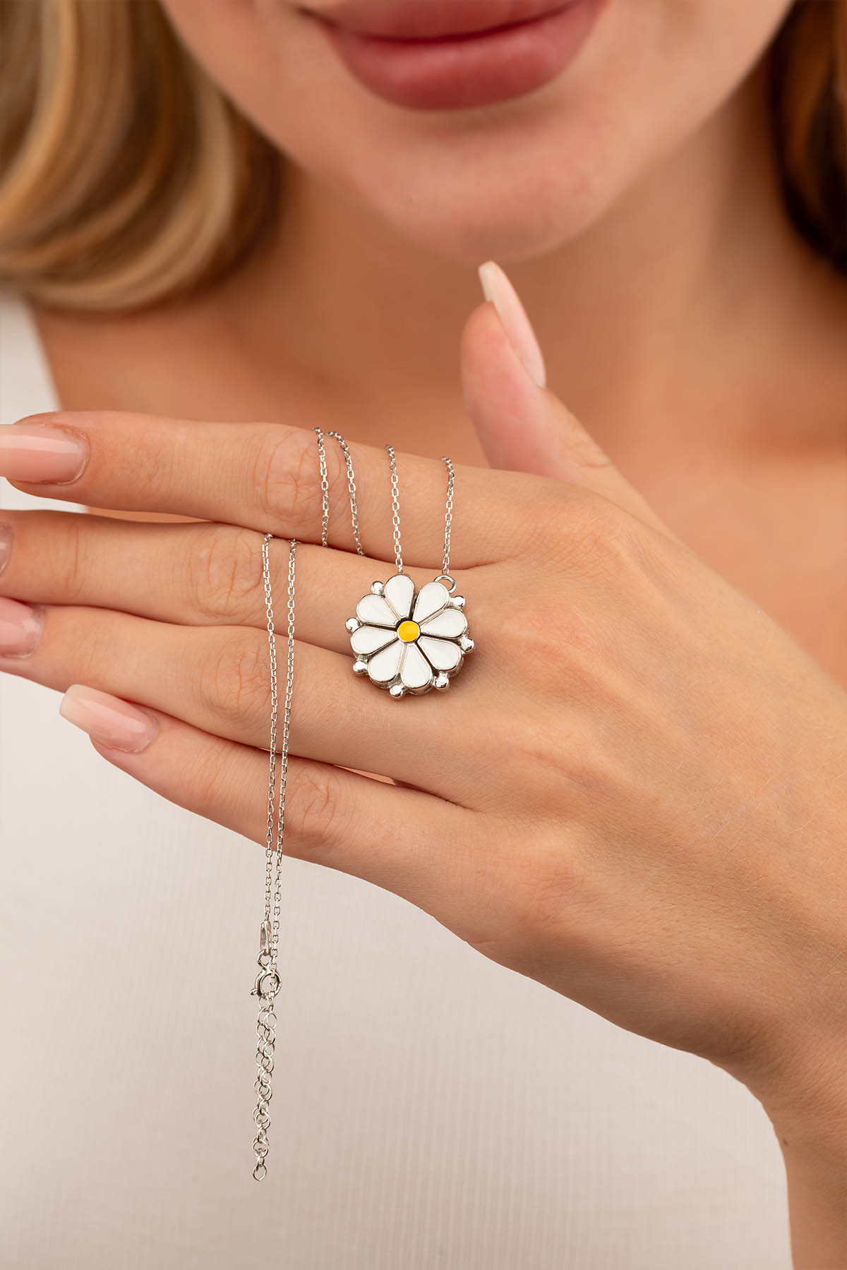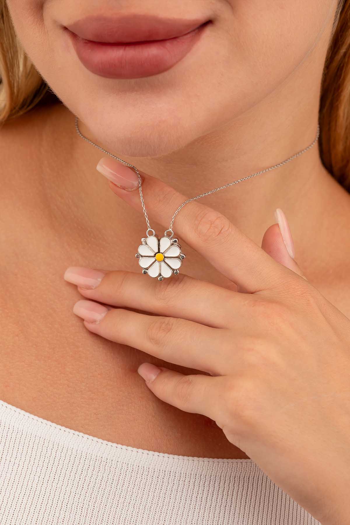 Bu özel tasarım, açılır kapanır mekanizması sayesinde iki farklı stil alternatifi sunar. Açık formda modern bir dizilim elde edilirken, kapalı formda ikonik papatya figürü ortaya çıkar. Böylece aynı kolyeyi farklı kombinlerle uyumlu şekilde yeniden yorumlayabilir, günlük stilinize hareket katabilir veya özel günlerde zarafetinize eşlik edecek bir takı olarak tercih edebilirsiniz.