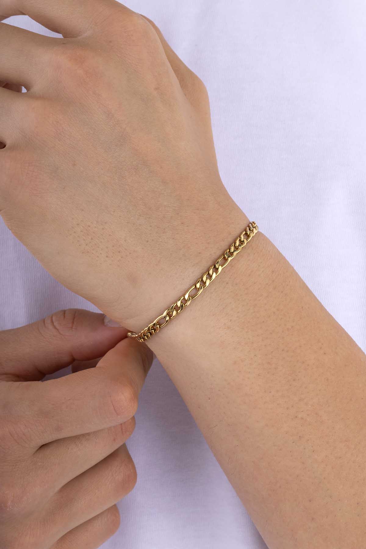 Ürün paslanmaz çelikten üretilmiş olup dayanıklılığı, kararmaya karşı direnci ve uzun süreli parlaklık korumasıyla bilinir. Metal yoğunluğunun dengeli yapısı sayesinde bilekte rahatsızlık hissi oluşturmaz ve konforlu bir kullanım sunar. Altın tonunun sıcak görünümü, bu bilekliği hem modern hem de zamansız bir aksesuar haline getirir.