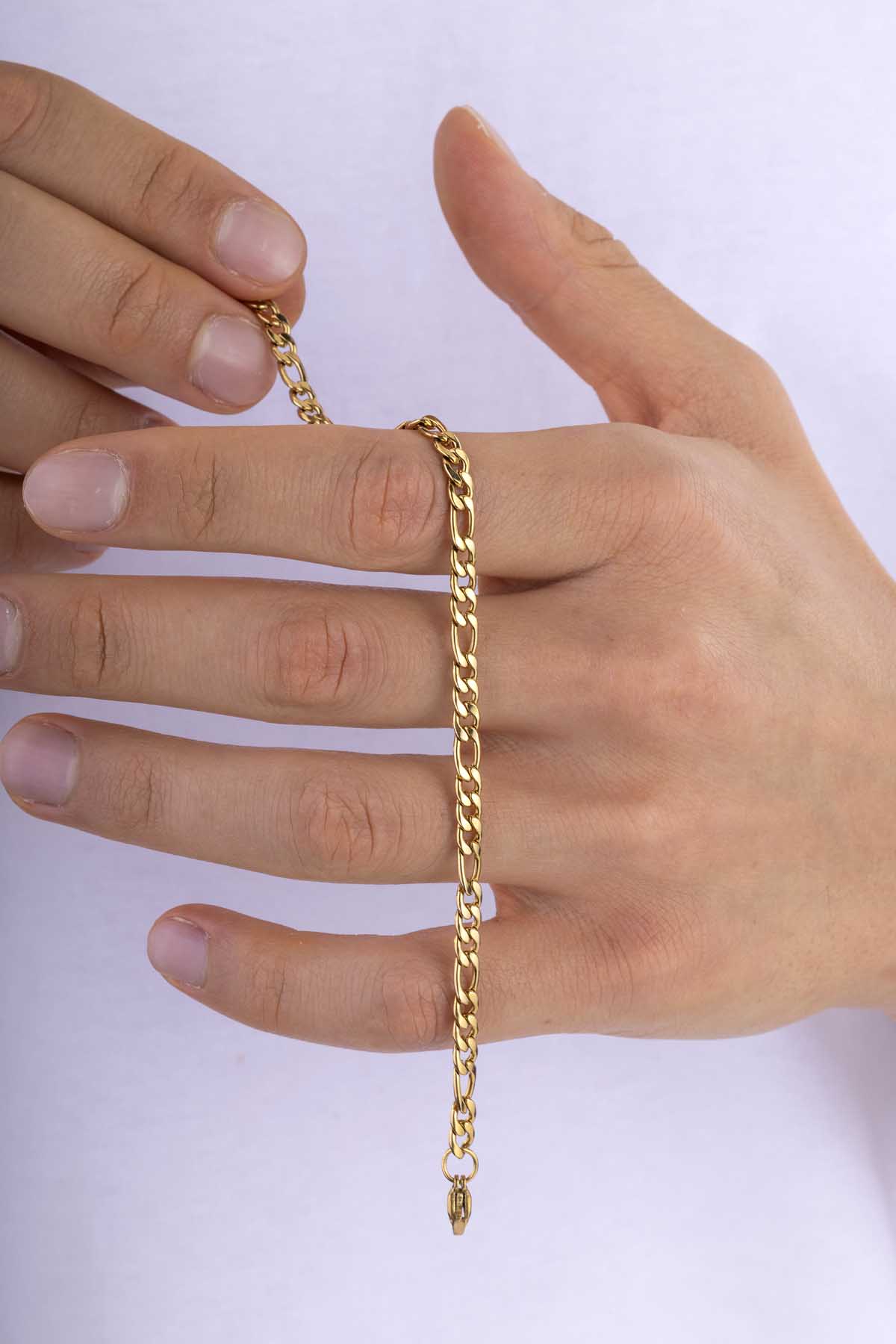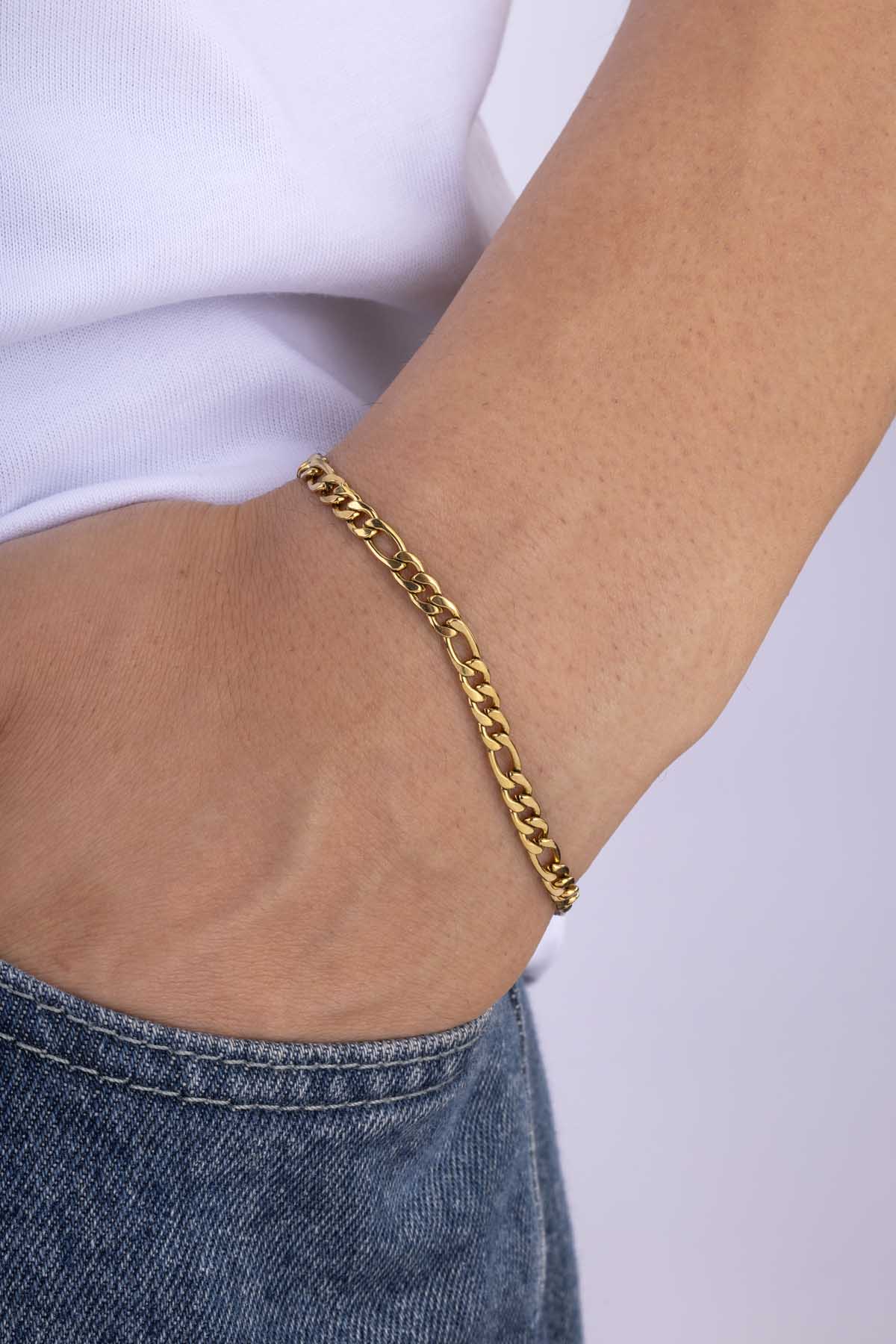 Altın kaplama geçmeli gurmet model erkek çelik bileklik, parlak yüzeyi ve güçlü zincir formuyla şık ve iddialı bir görünüm sunar.