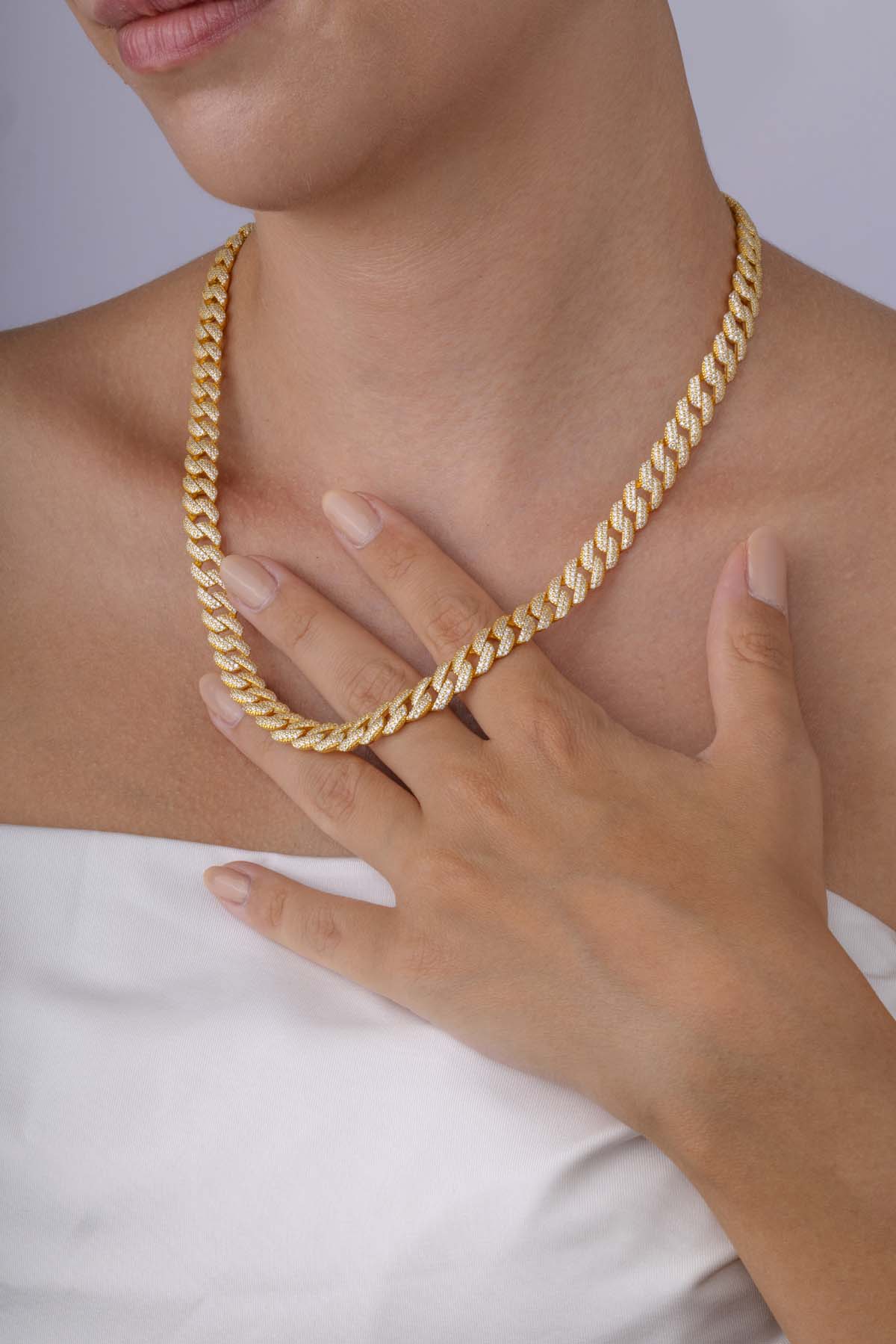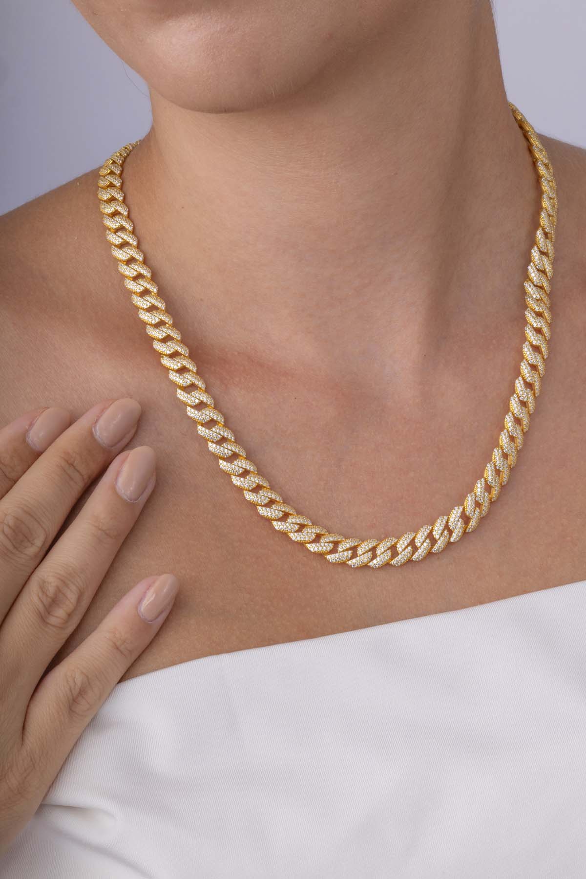12 Ay'a Varan Taksit Seçeneği925 ayar gümüşten üretilen bu gurmet zincir kolye, altın kaplamasıyla dikkat çeken sofistike bir görünüme sahip. Güçlü zincir formu, zarafetle birleşerek modern ve klasik tarzı bir arada sunuyor. Işıltılı taş detaylarıyla zenginleştirilen tasarım, düğün, nişan, balo ve davet gibi özel günlerde şıklığınızı tamamlayan iddialı bir aksesuar oluyor.
