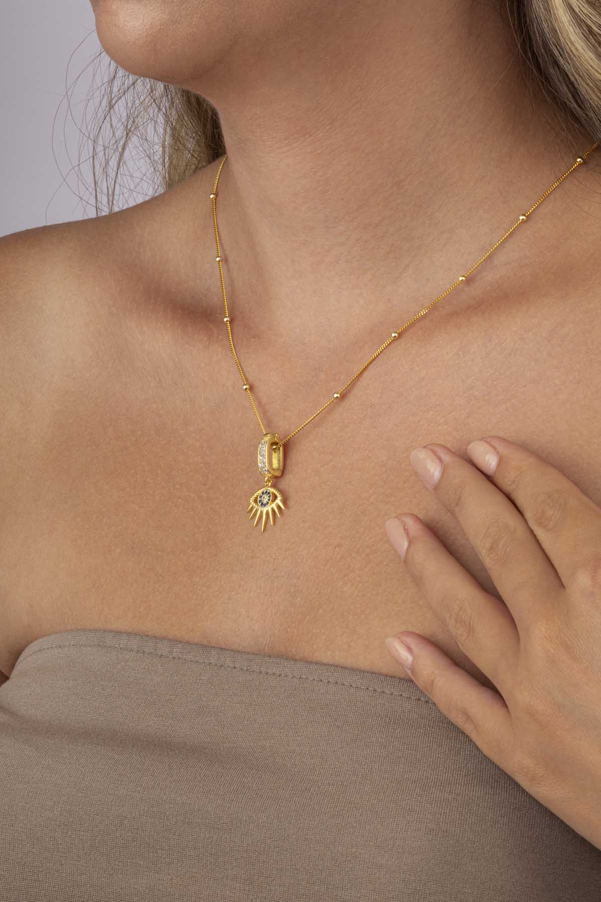 Estetik ve derin anlamı bir araya getiren 925 ayar gümüş altın kaplama nazar boncuğu göz kolye, günlük kullanıma uygun şık bir takıdır. Nazar boncuğu ve göz figürü, tarih boyunca kötü enerjilerden korunmanın, şansı çekmenin ve ruhsal dengeyi sağlamanın sembolü olmuştur. Bu özel kolye, yalnızca zarif bir aksesuar değil aynı zamanda koruyucu bir anlam taşıyan güçlü bir semboldür.