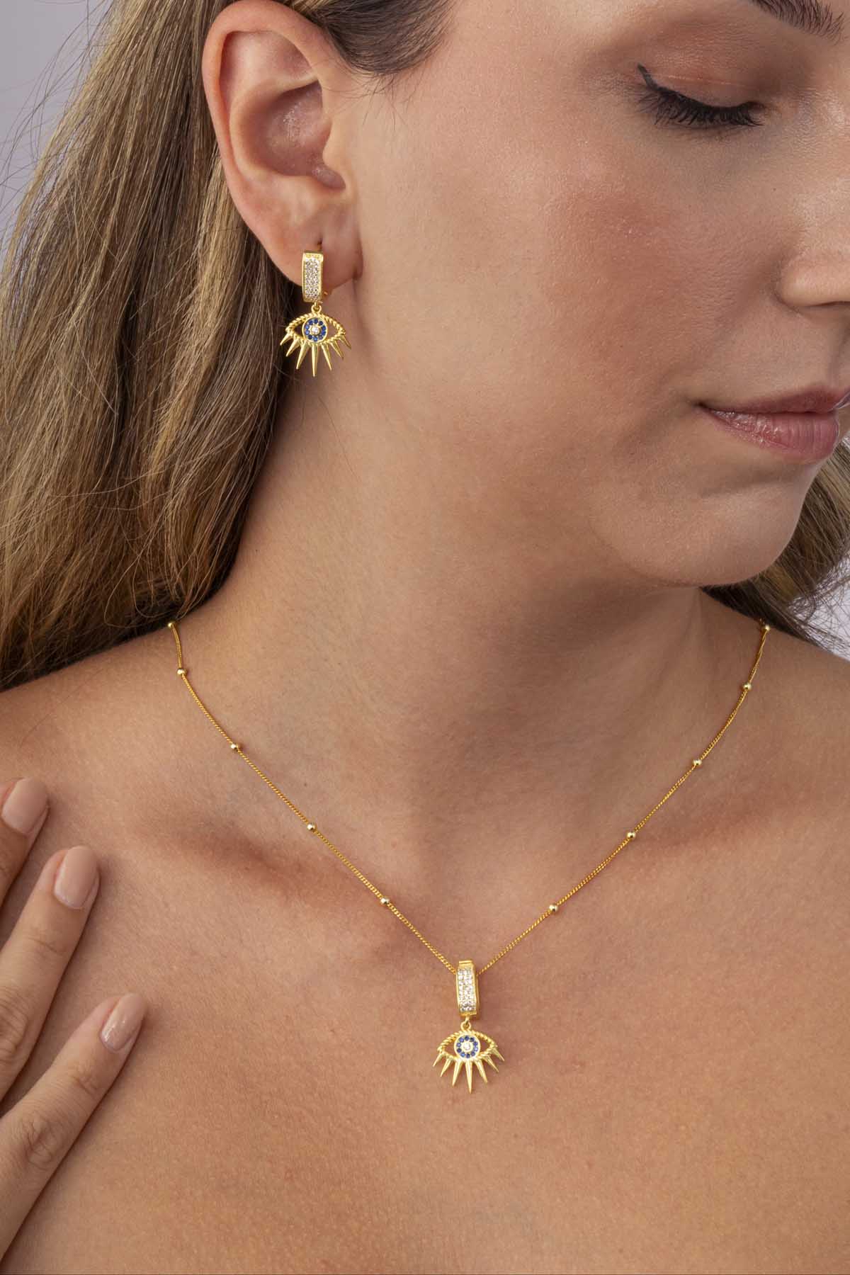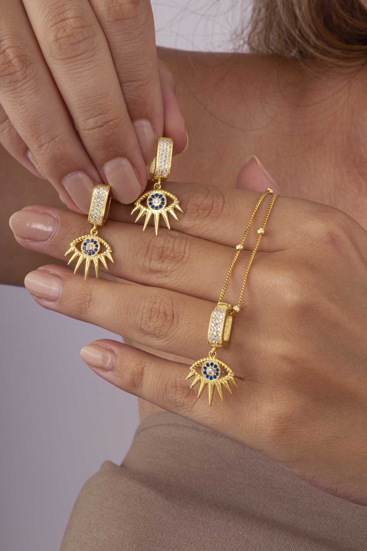 Şıklığı ve koruyucu enerjiyi bir arada sunan nazar figürlü altın kaplama kombin, her an yanınızda taşıyabileceğiniz zarif bir tılsım.
