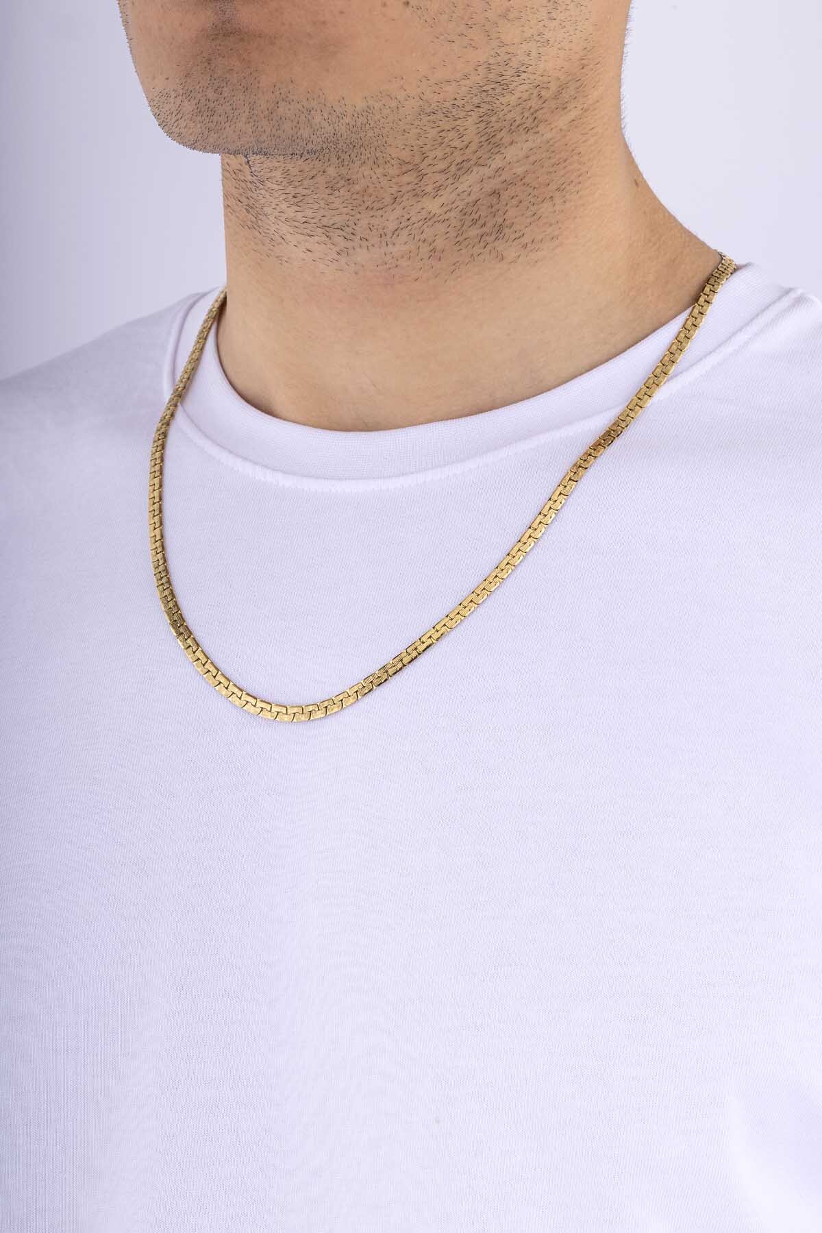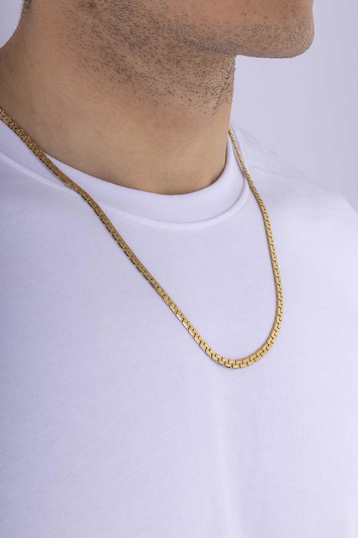 Altın kaplama çelikten üretilmiş kare yassı formuyla modern, maskülen ve zamansız bir stil sunan bu erkek zincir, dayanıklı yapısı ve şık görünümüyle günlük kullanım ve özel günler için ideal bir aksesuar seçeneği oluşturur.
