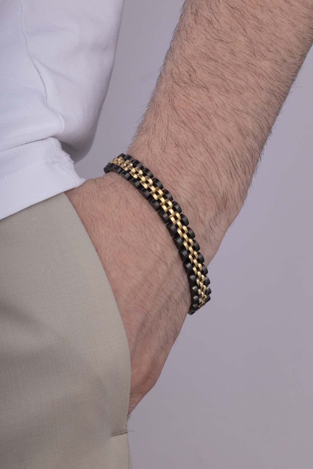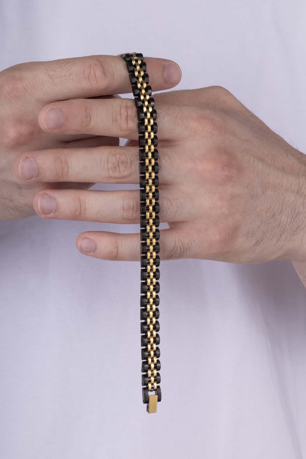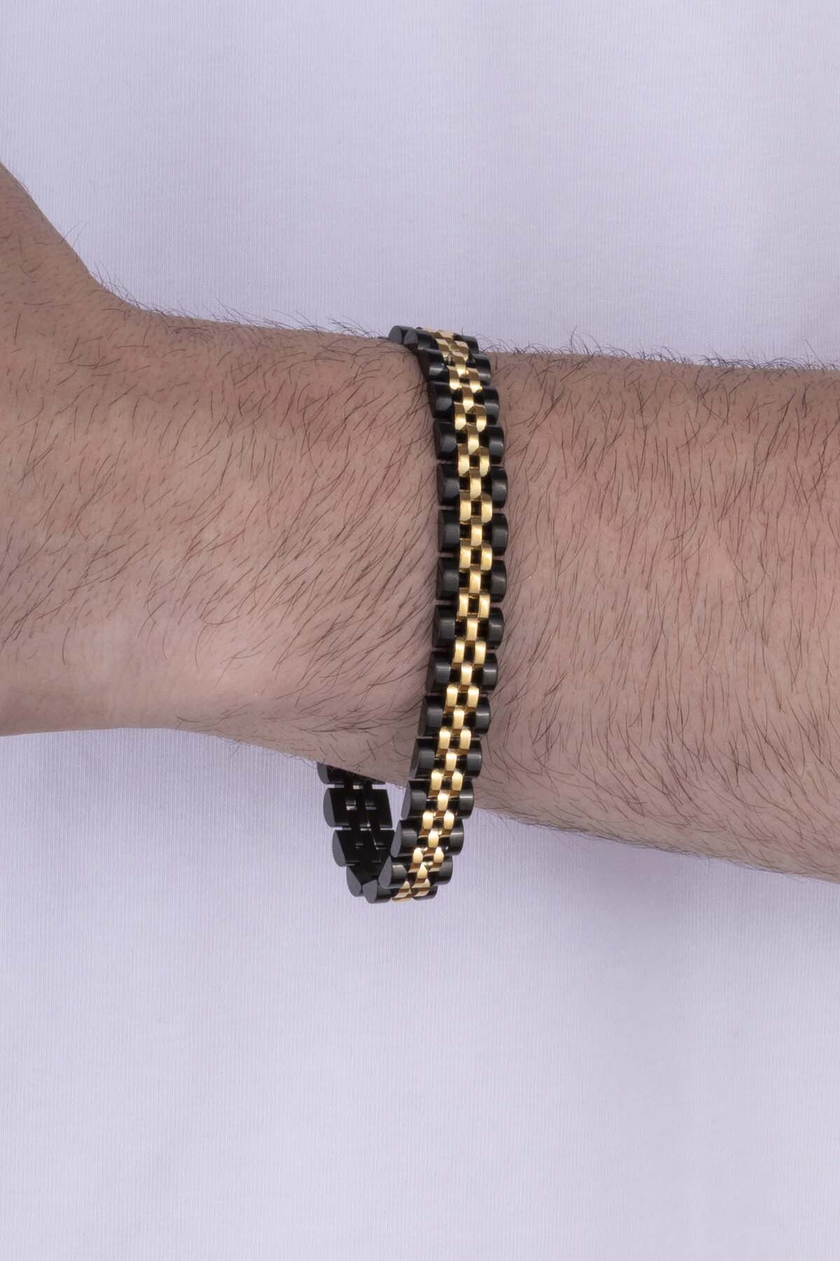 Siyah ve altın rengin şık uyumunu yansıtan bu çelik bileklik, modern tasarımıyla dikkat çeker. Dayanıklı yapısı ve göz alıcı tasarımıyla hediye için de mükemmel bir seçimdir.
