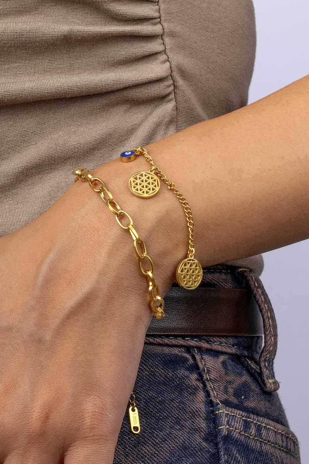 Altın Kaplama Çift Zincirli Nazar Boncuklu Charm Çelik Bileklik - 1