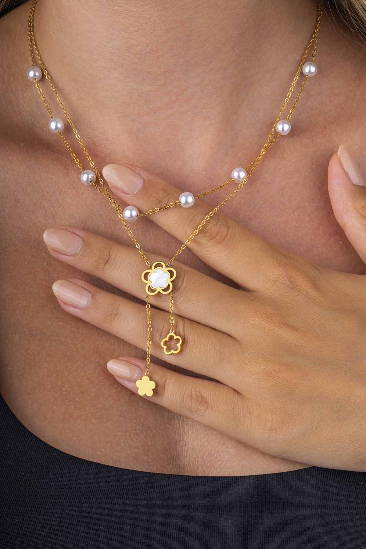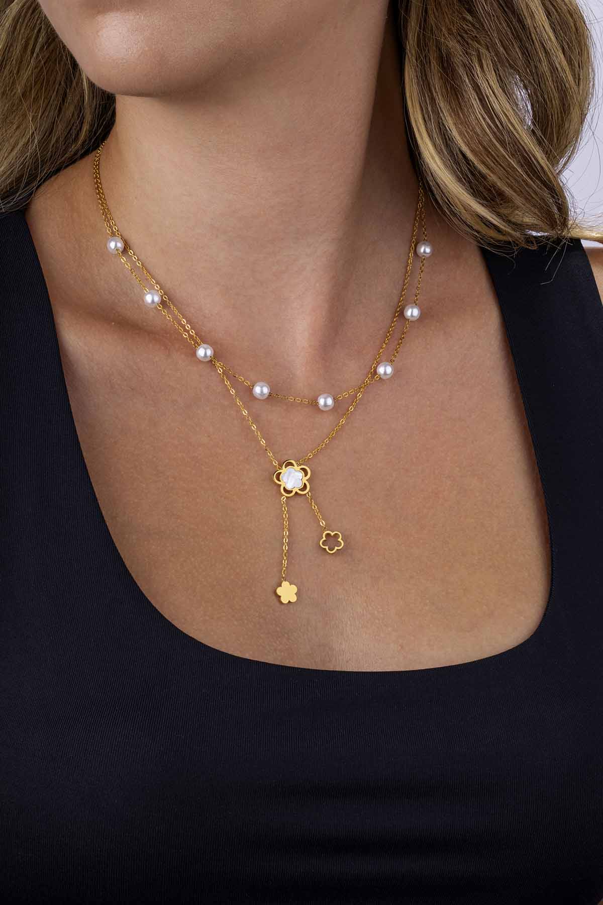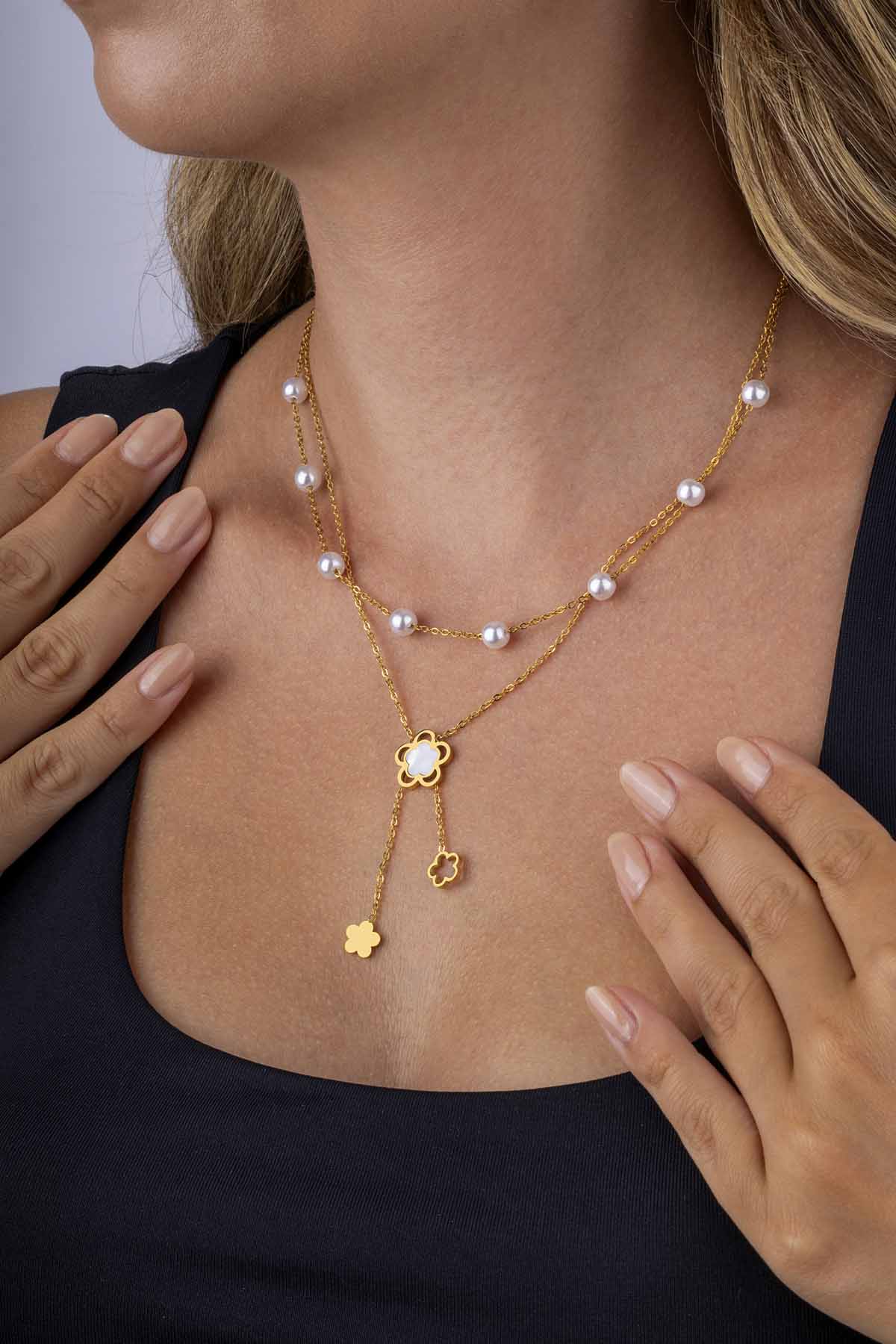 Altın Kaplama İnci Taneli Yonca Motifli Kadın Çelik Kolye, zarif inci detayları ve şık yonca tasarımıyla her stile uyum sağlar.
