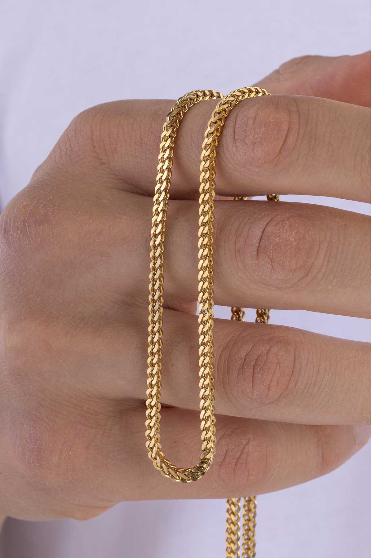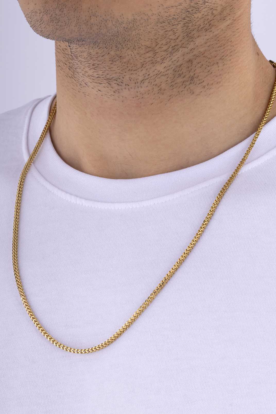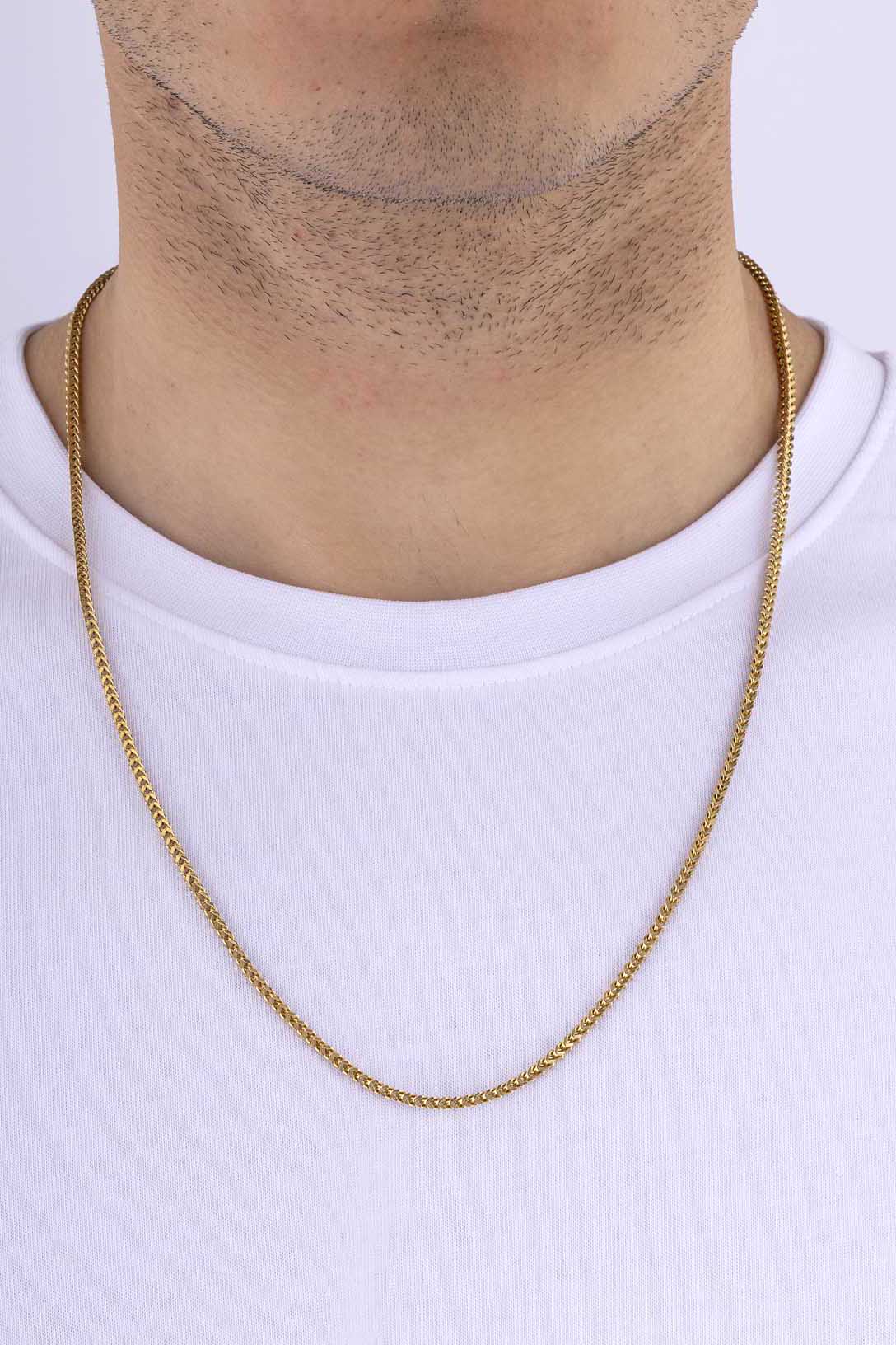 Altın kaplama köşeli kare kesim tasarıma sahip erkek çelik zincir, modern ve gösterişli tarzı güçlü bir duruşla birleştiren dayanıklı bir aksesuardır.