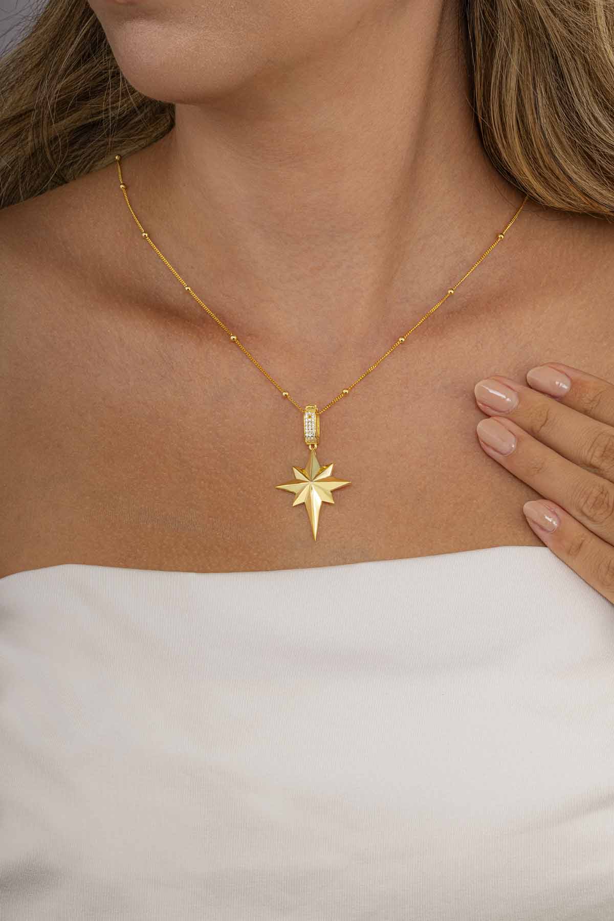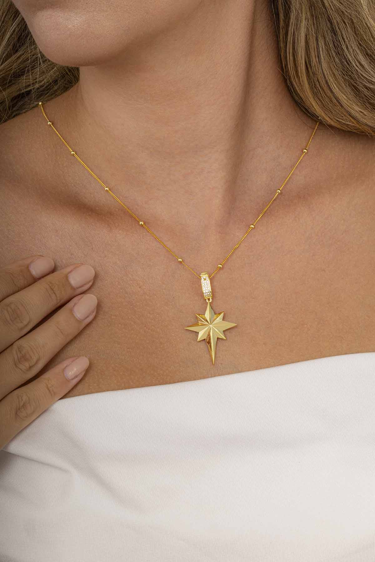 Yol gösterici ışığıyla umut ve yön bulmayı simgeleyen 925 ayar gümüş altın kaplama kutup yıldızı kolye, günlük şıklığınıza anlamlı bir dokunuş katıyor.