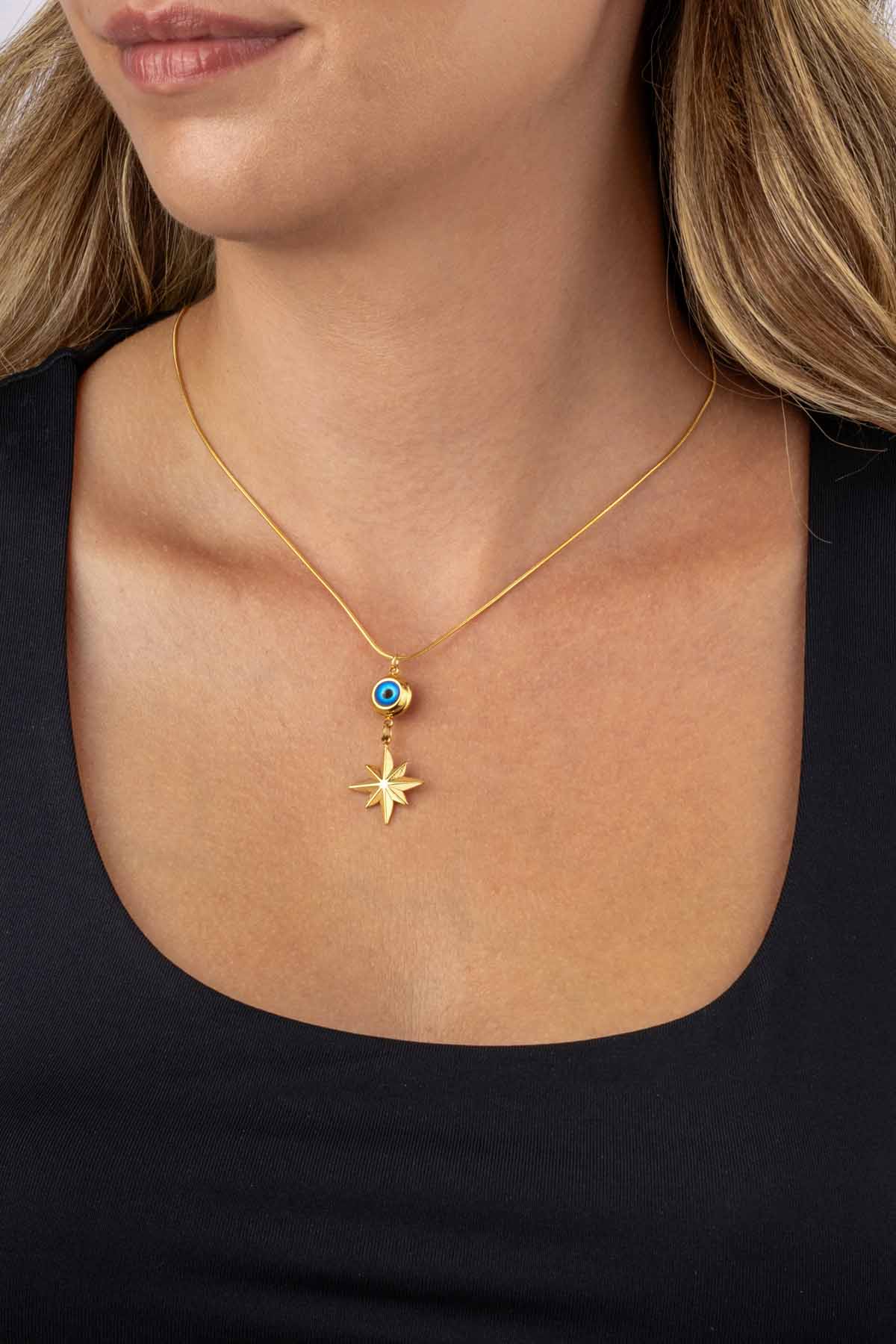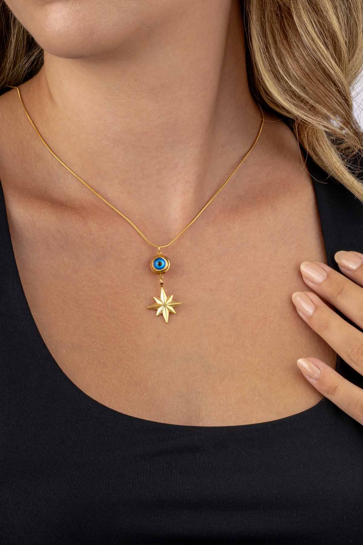 Altın Kaplama Kutup Yıldızı Kadın Çelik Kolye, nazar boncuğu detayını kutup yıldızının şıklığıyla buluşturarak hem zarafet hem de anlam taşıyan özel bir takıdır.