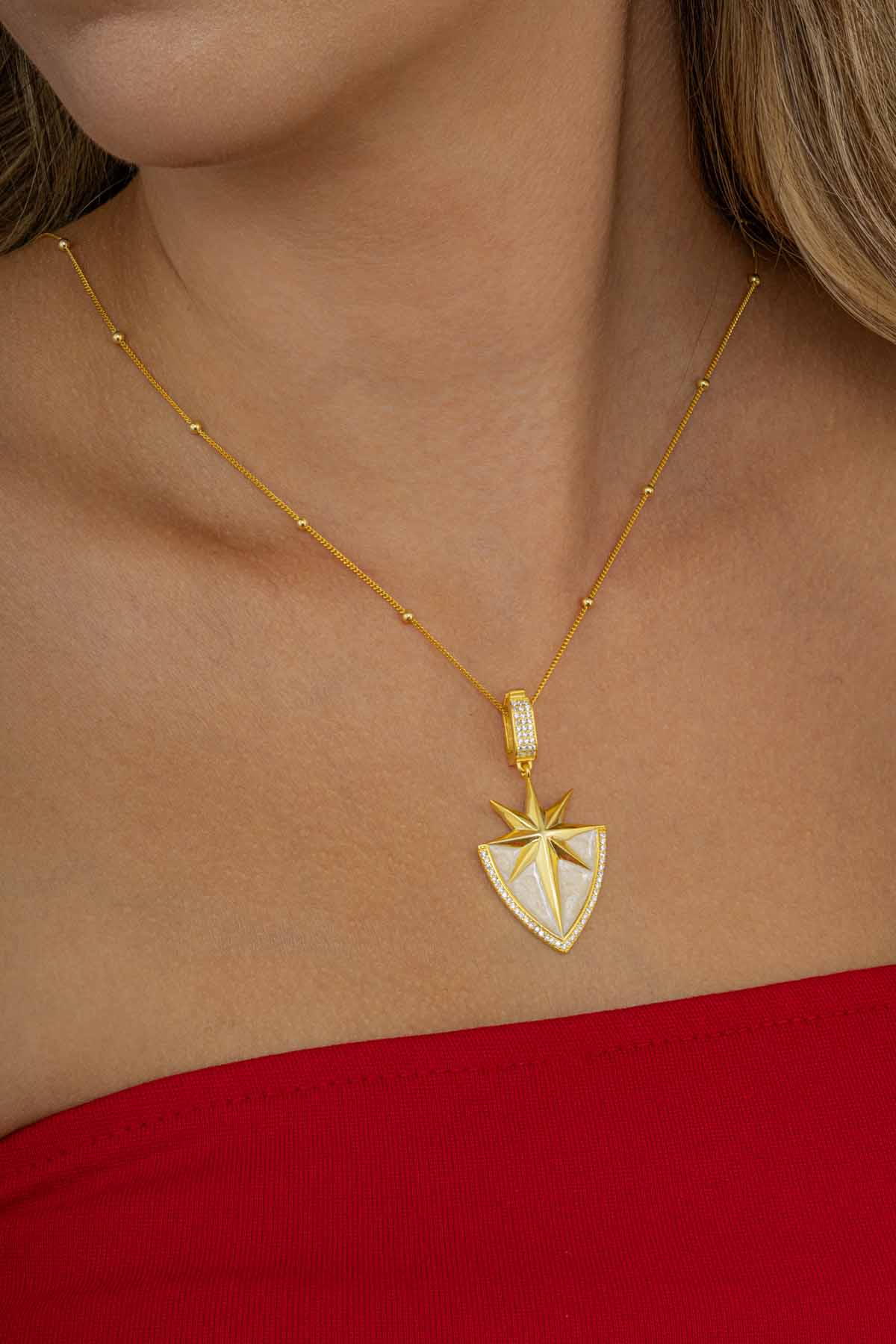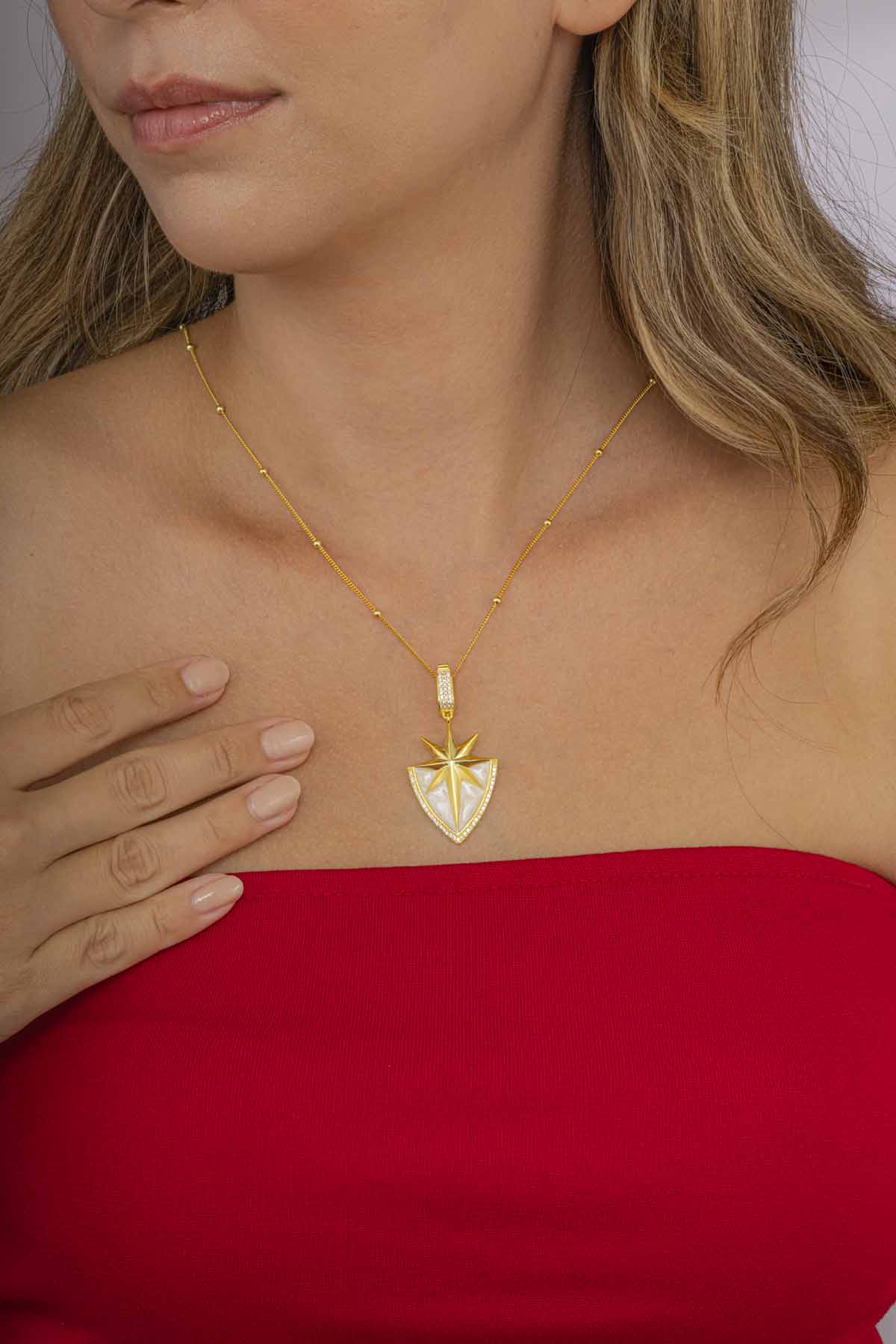 Altın kaplama detayları ve dikkat çekici parlaklığıyla göz alıcı bir duruş sergileyen kolye, her kombine kolayca uyum sağlar. Hafif yapısı sayesinde gün boyu rahatlıkla kullanılabilir. 925 ayar gümüşün sağlamlığıyla uzun yıllar kullanılabilecek bu özel tasarım, şıklığıyla olduğu kadar sembolik anlamıyla da değer katar.