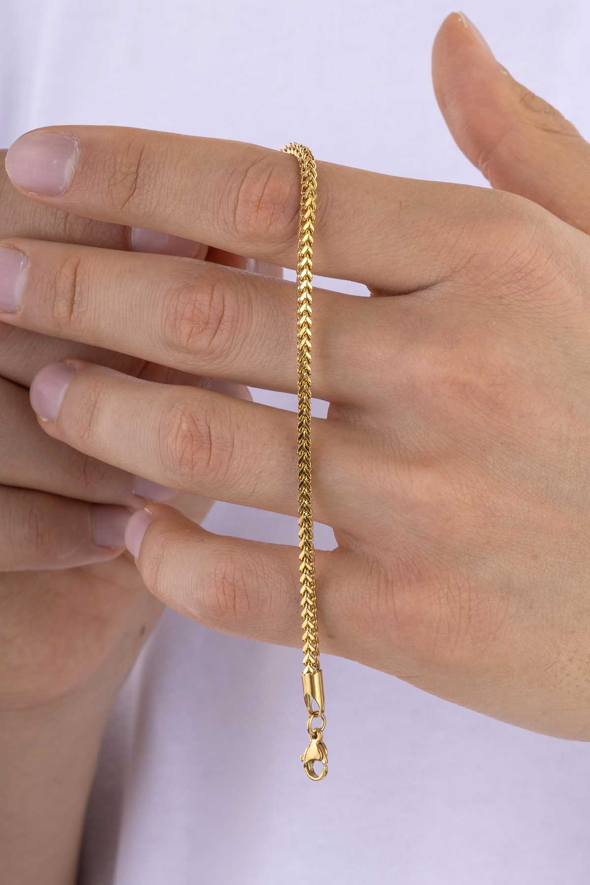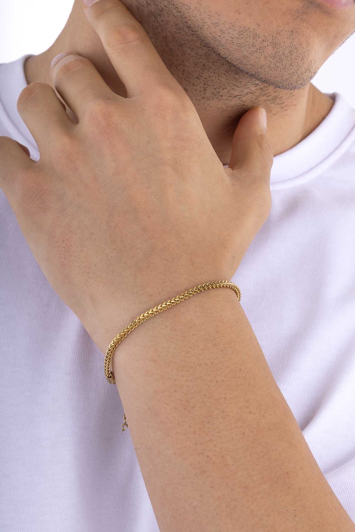 Altın kaplama tilki kuyruğu erkek çelik bileklik, parlak dokusu ve modern örgü formuyla şık ve premium bir görünüm sunar.
