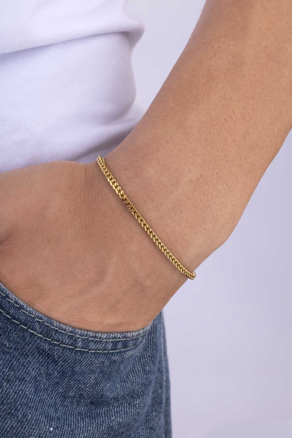 Paslanmaz çelik materyal üzerine uygulanan yüksek kaliteli altın kaplama sayesinde ürün kararma yapmaz, uzun süre parlaklığını korur ve dayanıklılığını kaybetmez. Hafif yapısı, bilekte rahat bir kullanım hissi sağlar. Minimal ama etkileyici bir tasarım dili taşıyan bu model, stiline sofistike bir dokunuş eklemek isteyen erkekler için ideal bir tercihtir.