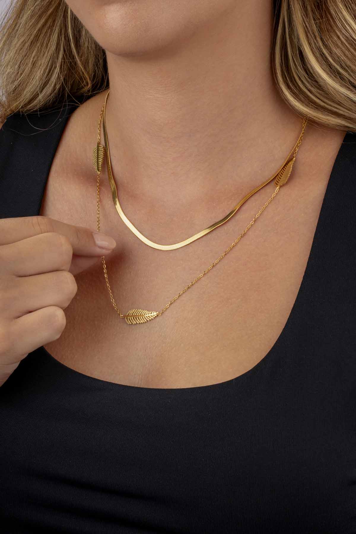 Doğadan ilham alan tasarımları sevenler için mükemmel bir seçim olan bu kolye, hediye alternatifi olarak da sevdiklerinizi mutlu edecek değerli bir parçadır. Altın kaplama çift zincir modelleri arasında fark yaratan yaprak motifli tasarımıyla koleksiyonunuza zarif bir dokunuş katar.