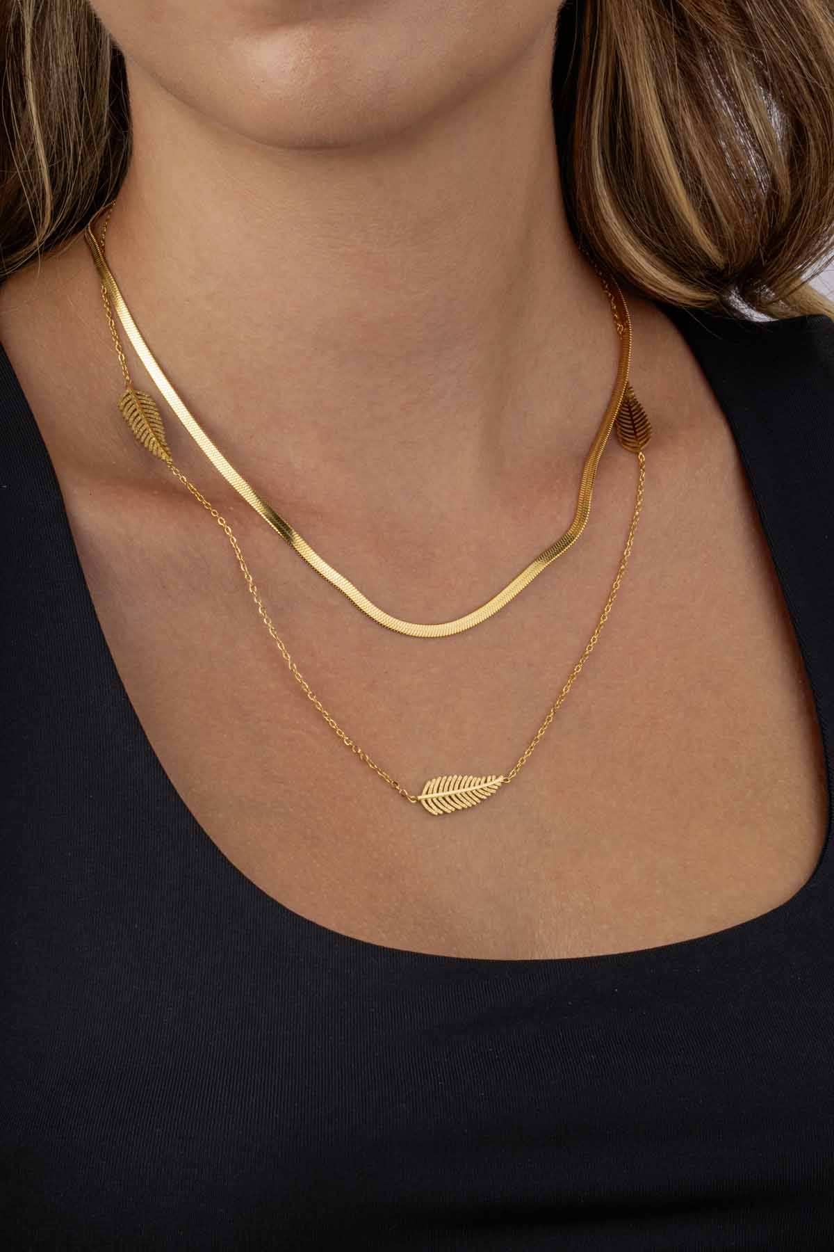 Altın Kaplama Yaprak Motifli Çift Zincir Kadın Çelik Kolye, zarif ve modern tasarımıyla öne çıkan şık bir takı modelidir. Üst katmanda yer alan klasik İtalyan zincir, alt katmanda ise doğayı yansıtan yaprak motifiyle süslenmiş ince zincir, kolyeye özgün bir katmanlı görünüm kazandırır.