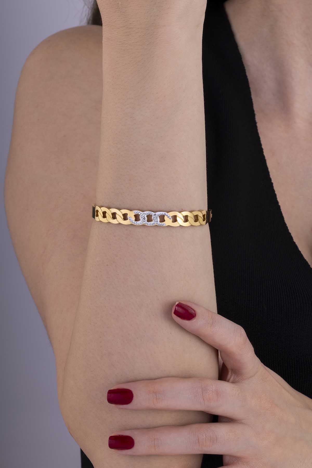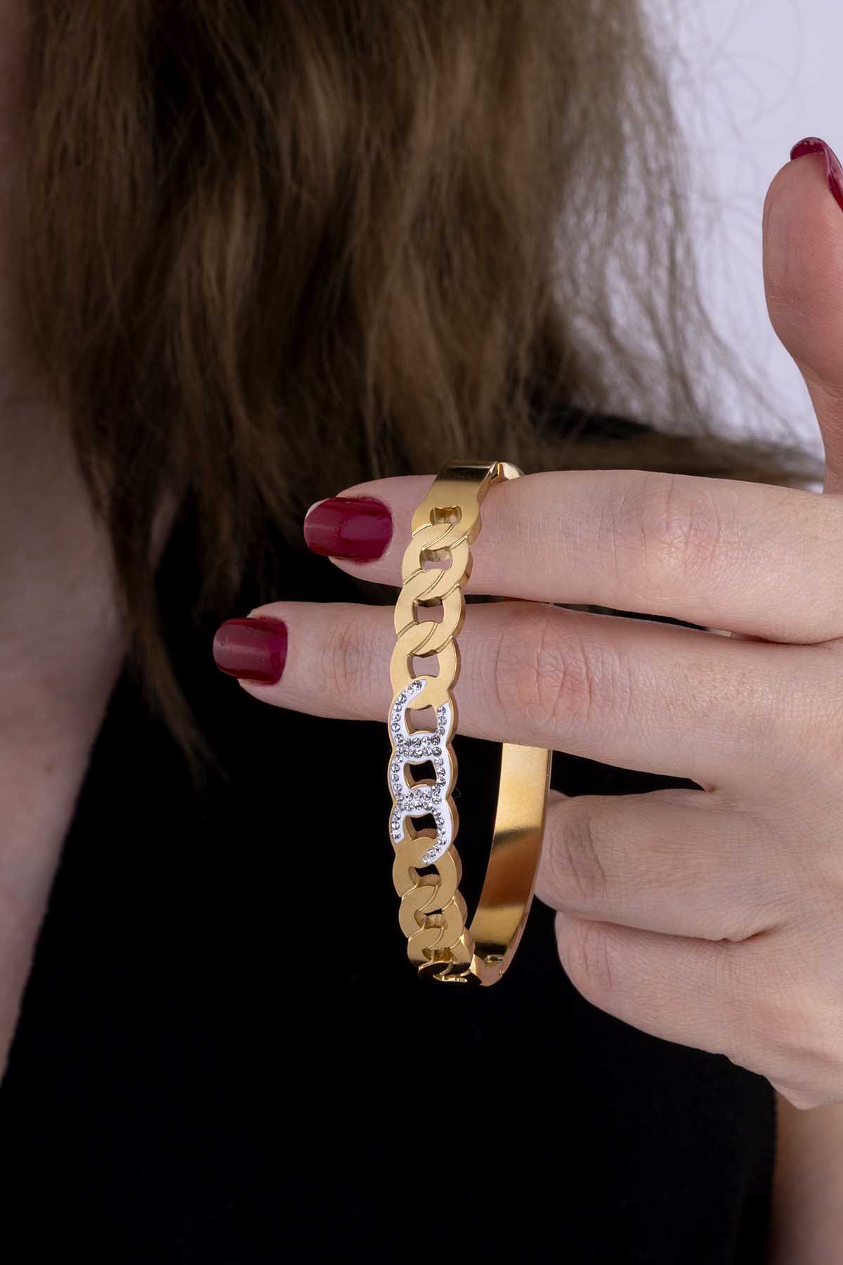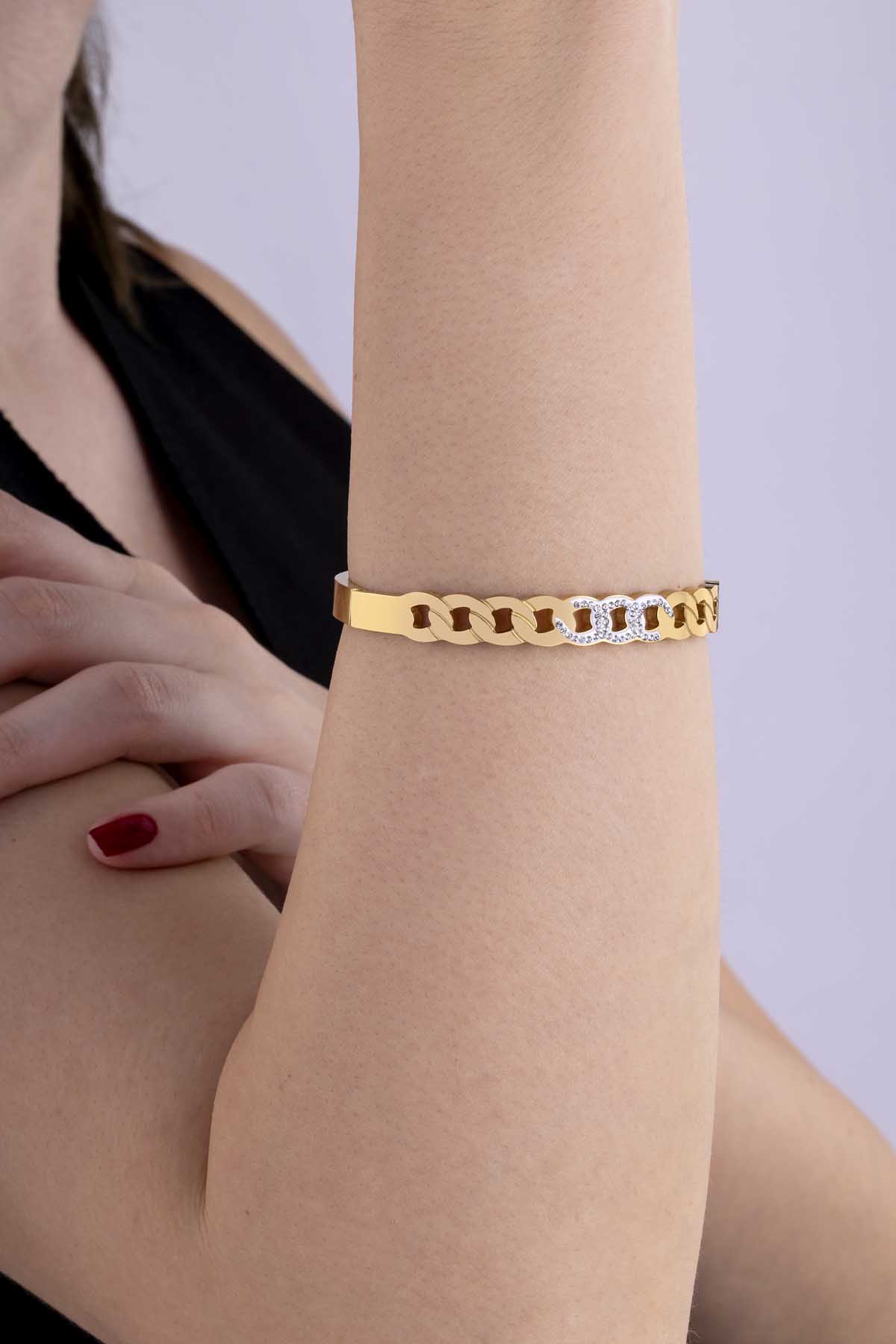 Altın kaplama zincir geçişli tasarımı ve taş detaylı bölümünün ışıltısıyla dikkat çeken bu çelik kelepçe bileklik, modern ve elegant bir stil sunar.
