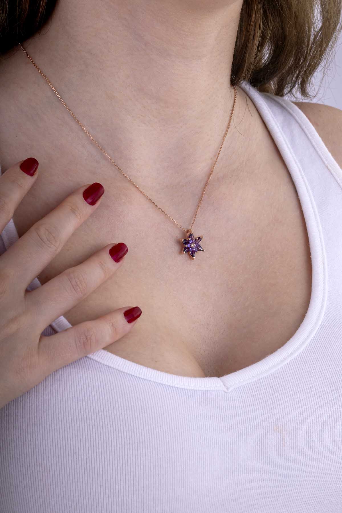 Mor tonlardaki taşlarla süslenmiş göz alıcı tasarımı, feminenliği ve zarafeti öne çıkarırken 925 ayar gümüşün dayanıklılığı sayesinde uzun yıllar kullanılabilecek değerli bir parçadır.