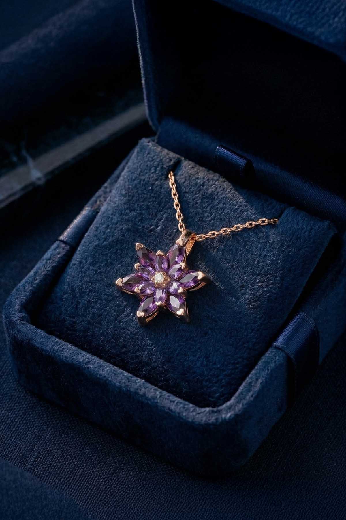Mor tonlardaki taşlarla süslenmiş göz alıcı tasarımı, feminenliği ve zarafeti öne çıkarırken 925 ayar gümüşün dayanıklılığı sayesinde uzun yıllar kullanılabilecek değerli bir parçadır.