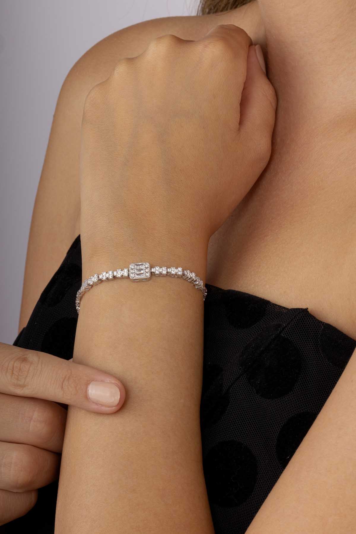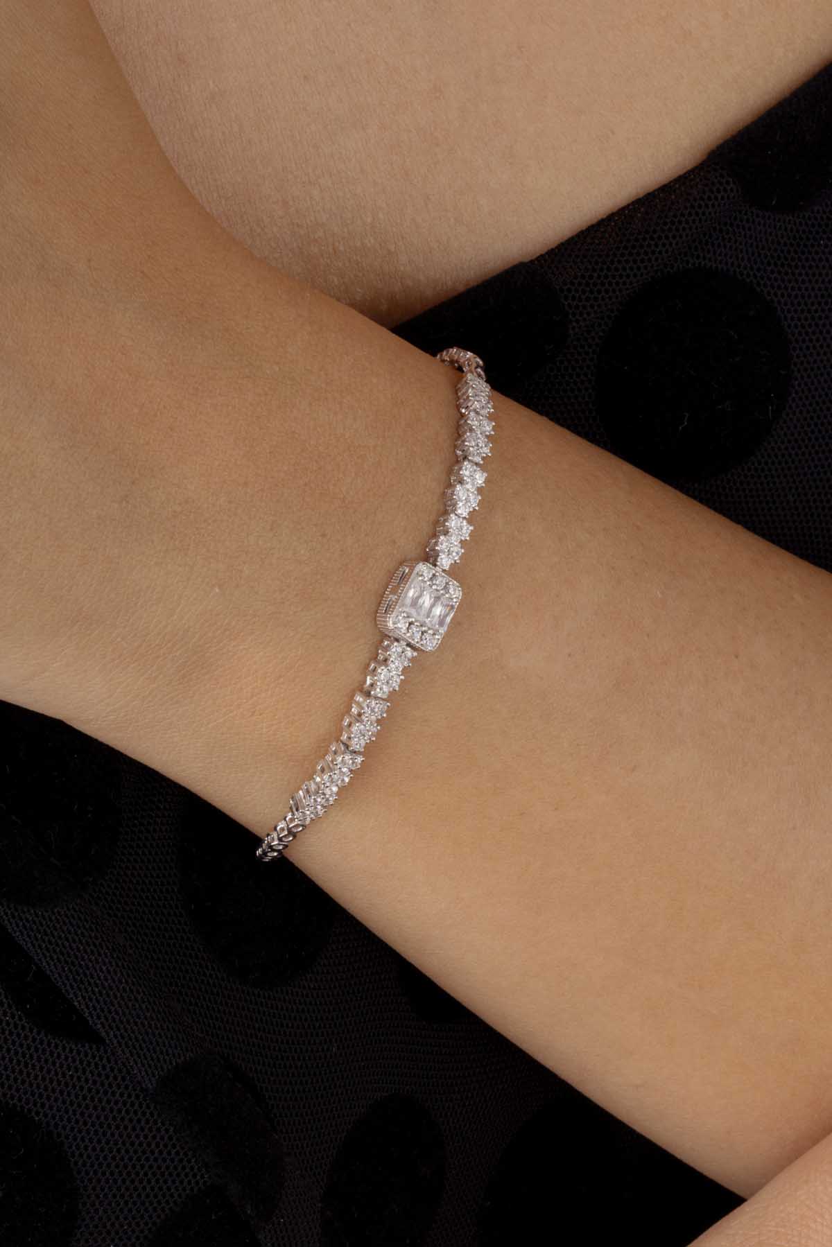 Baget Taşlı Rodyum Kaplama Su Yolu 925 Ayar Gümüş Bileklik - 1