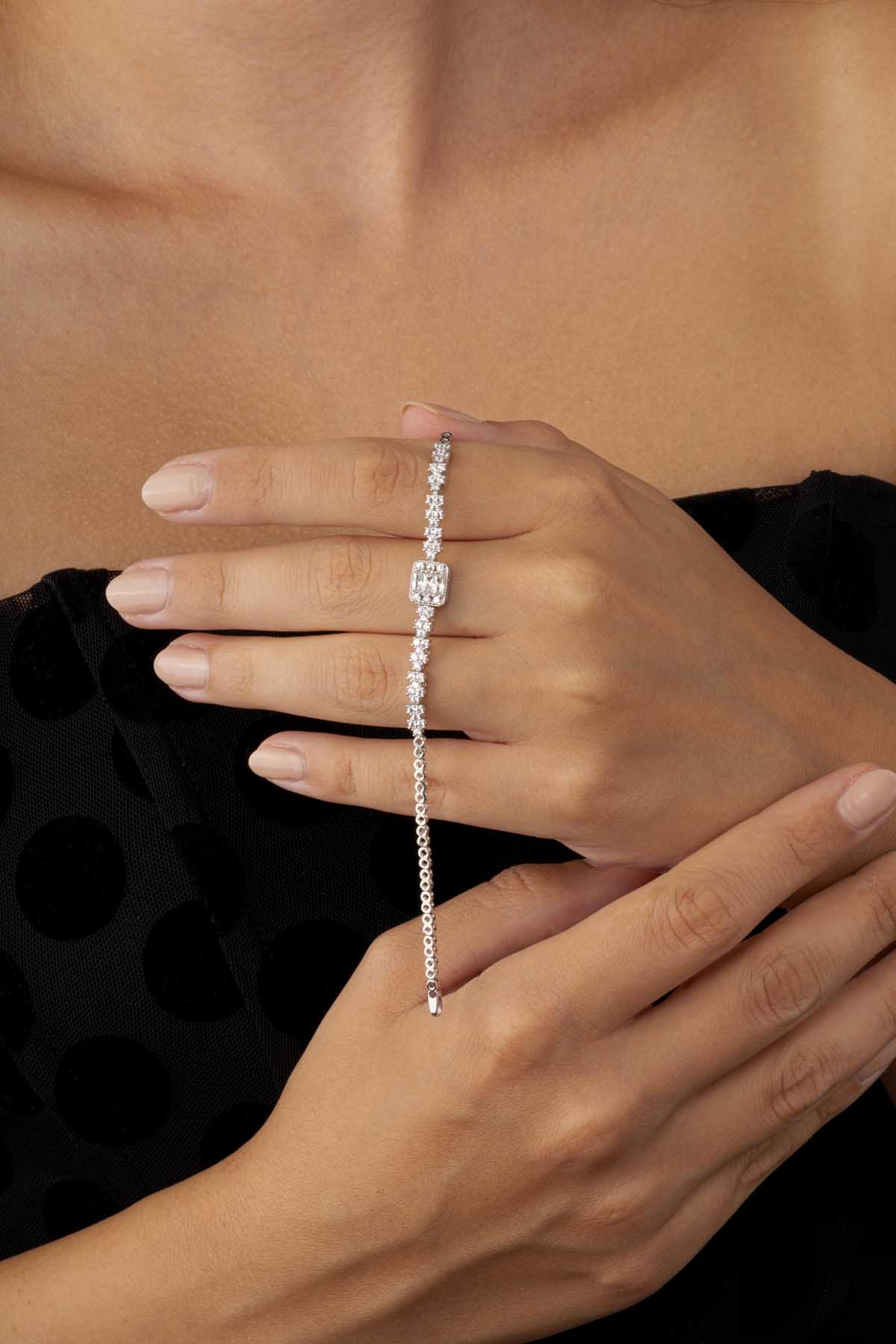 Baget Taşlı Rodyum Kaplama Su Yolu 925 Ayar Gümüş Bileklik - 2