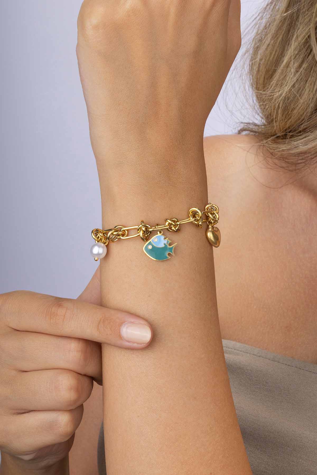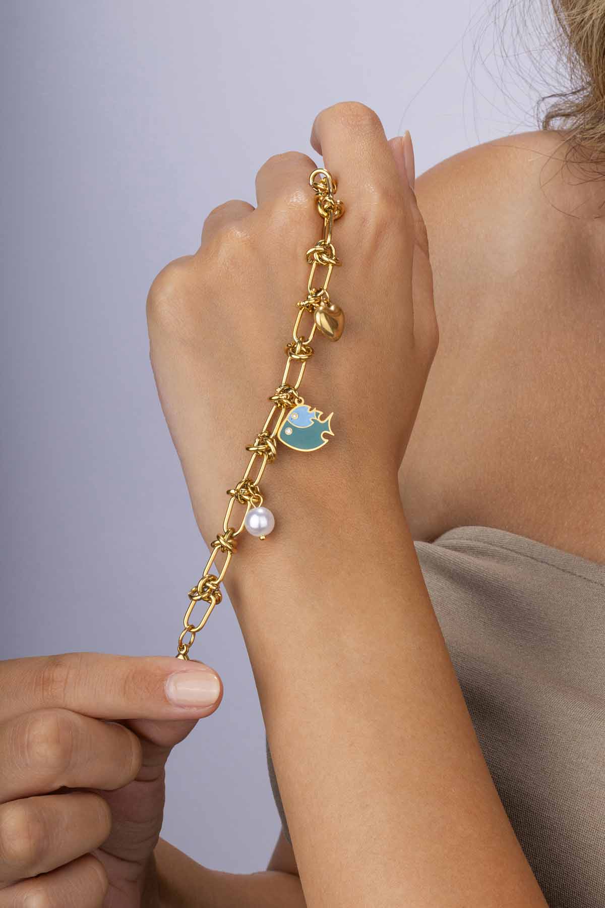 “Balık, inci ve kalp figürlü altın kaplama çelik charm bileklik, kararma yapmayan yapısıyla günlük şıklığınızı tamamlayan modern ve zarif bir aksesuar.”