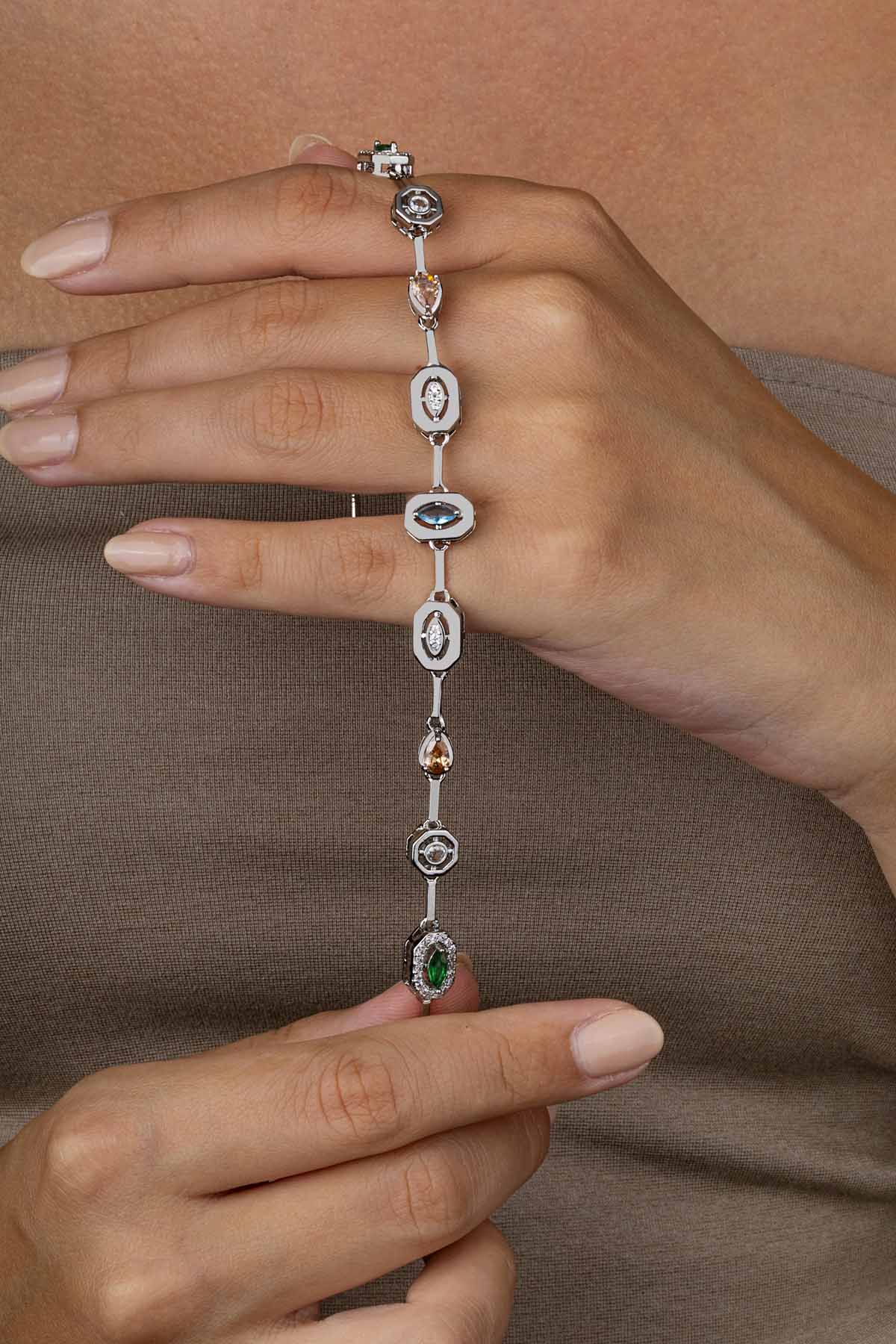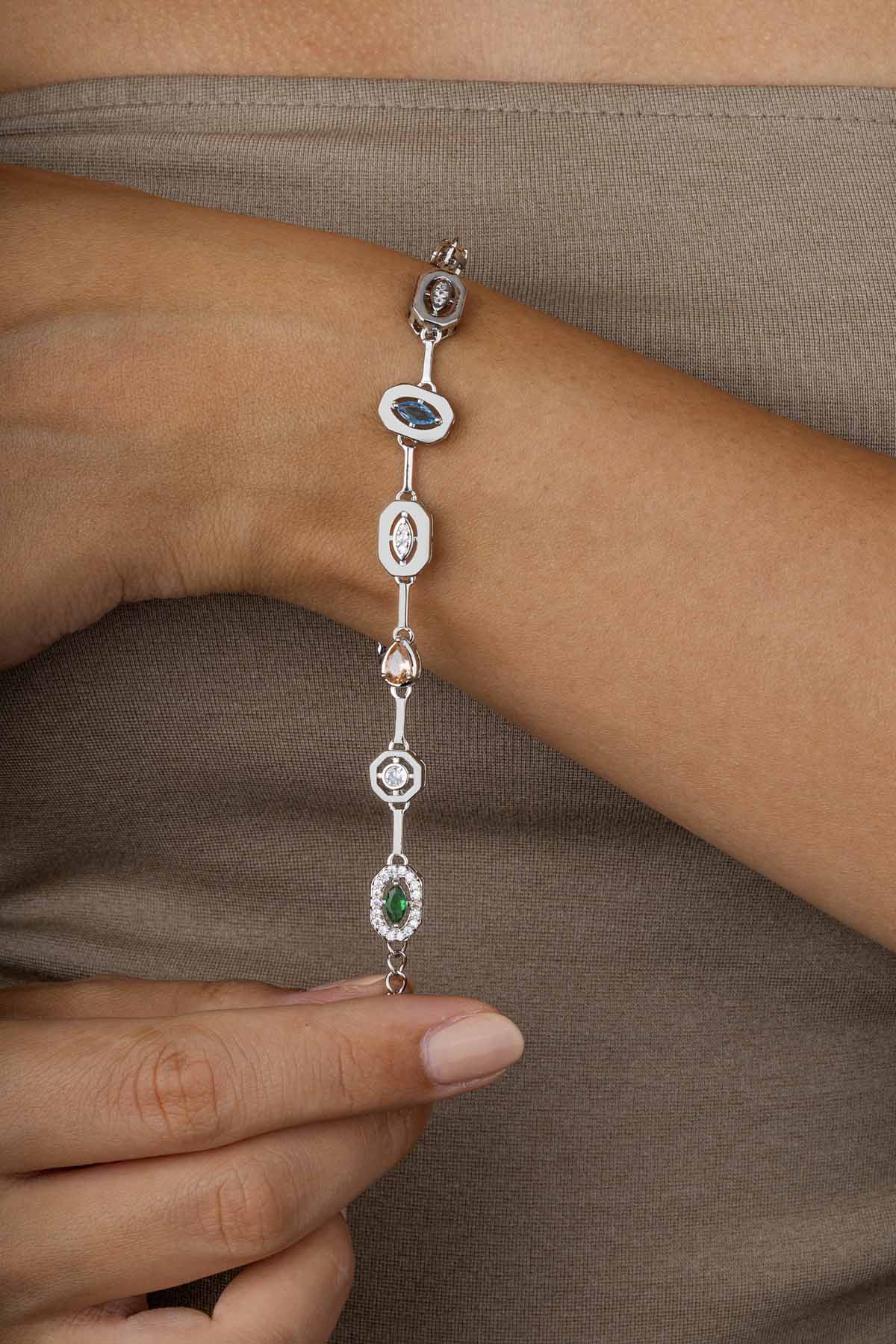 Kalite, estetik ve modern tasarımı bir arada sunan bu bileklik, takı koleksiyonlarına zarafet katmak isteyen kadınlar için mükemmel bir tercihtir. Farklı renkleri bir araya getiren göz alıcı tasarımıyla stilinizi ön plana çıkarır ve her bakışta etkileyici bir şıklık sunar.