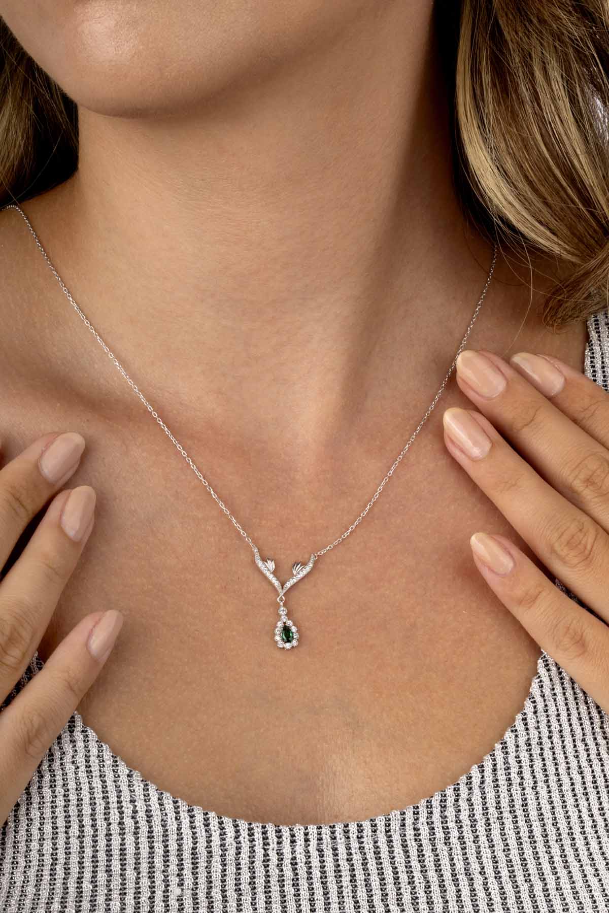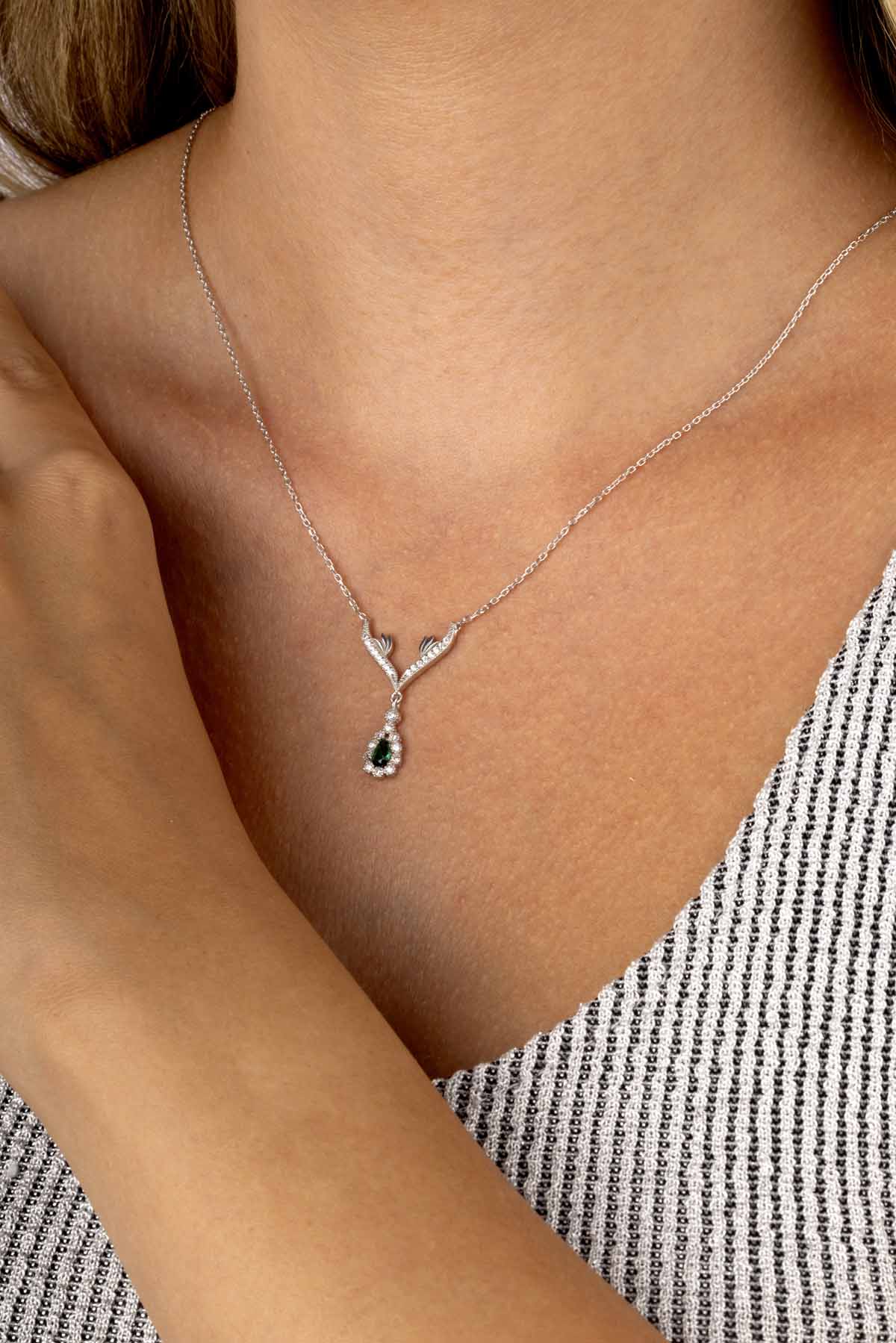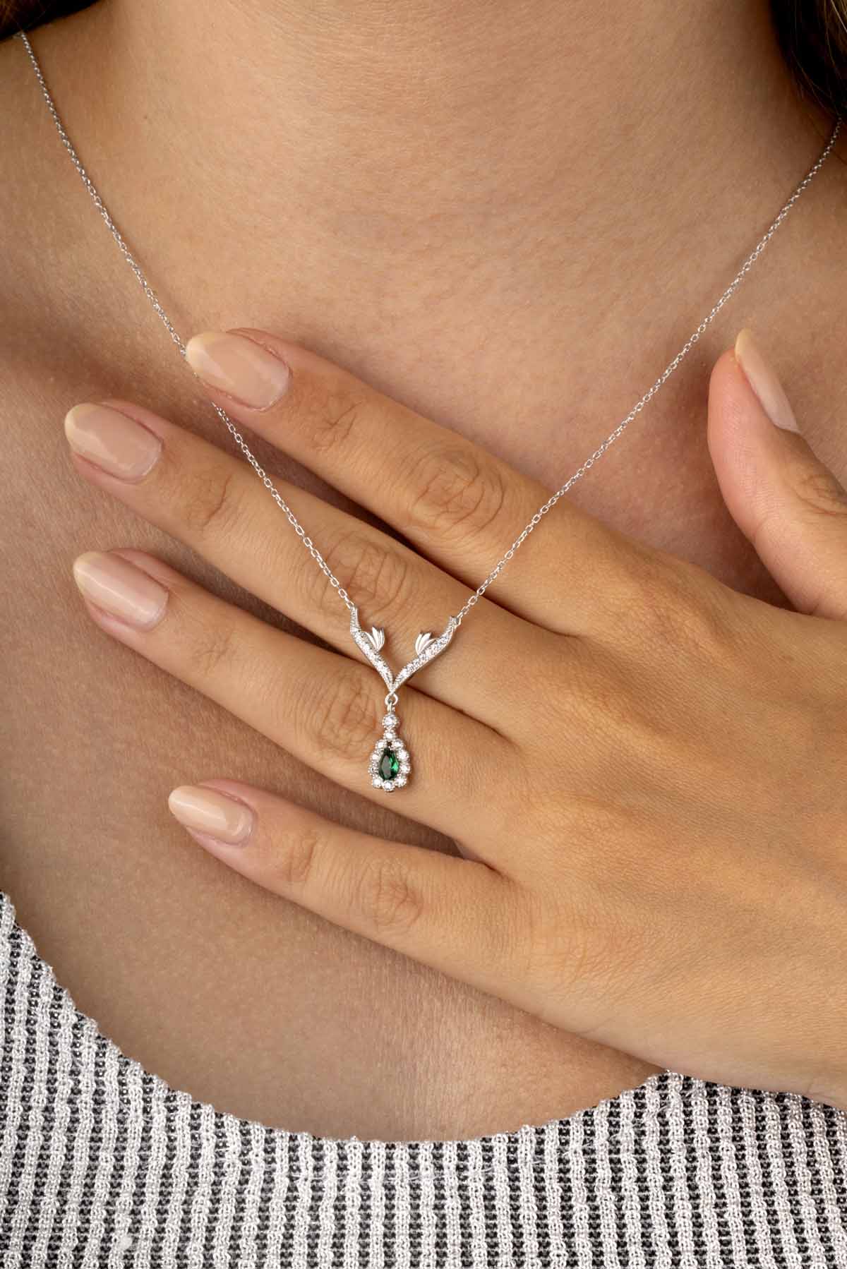 Beyaz Altın Kaplama Zümrüt Damla Taşlı Su Yolu Kadın Gümüş Kolye - 1