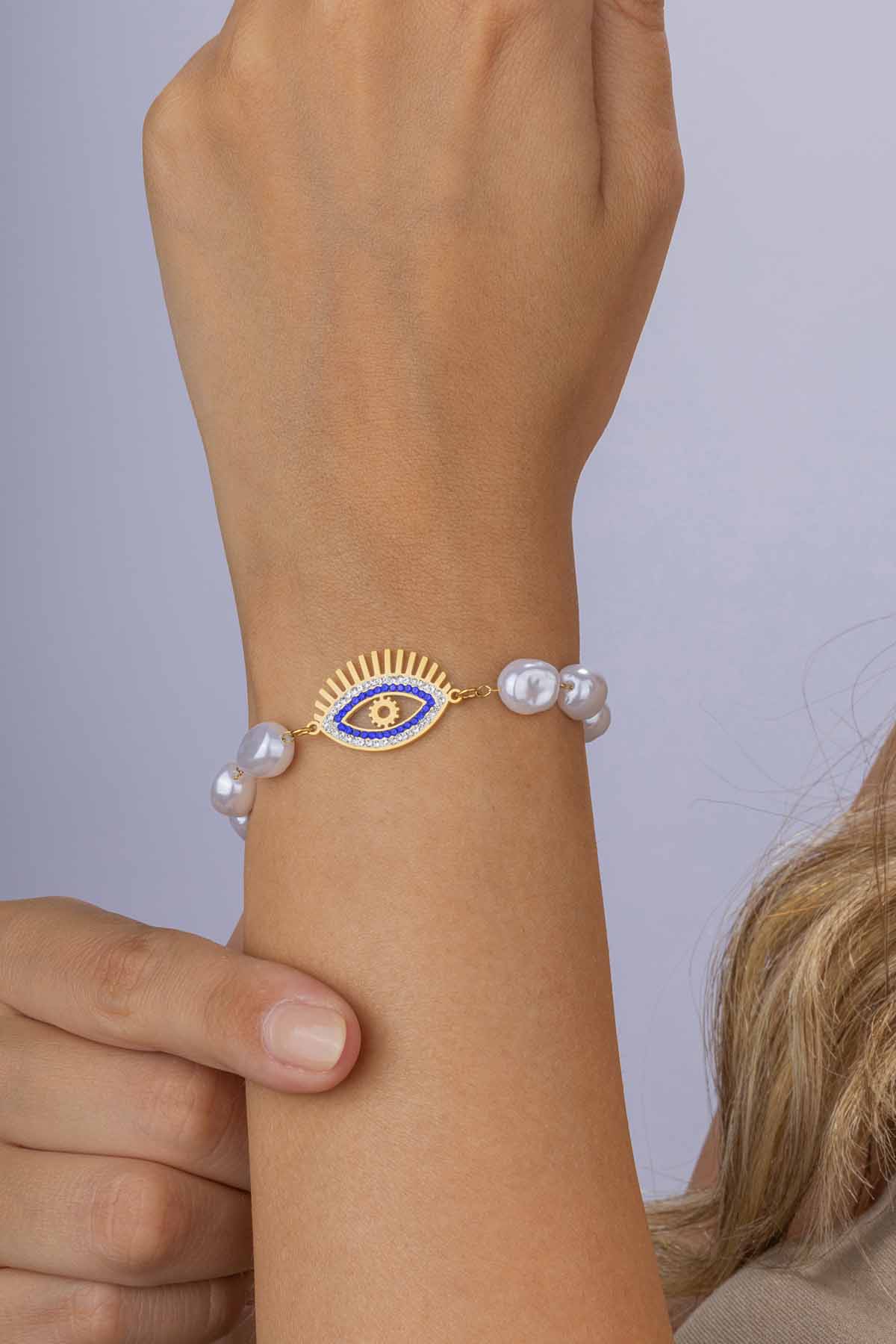 Altın kaplama çelik yapısıyla uzun ömürlü ve dayanıklı bir kullanım sunan bu bileklik, kararma ve çizilmelere karşı dirençlidir. Beyaz incilerin zarafetiyle birleşen göz figürü, bileğinizde hem modern hem de anlamlı bir dokunuş yaratır.