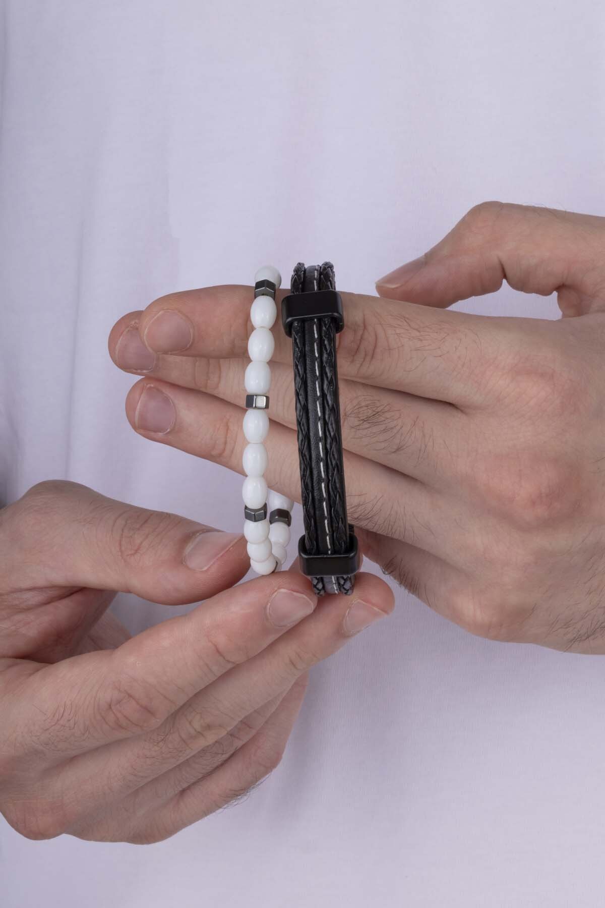 Beyaz Jade Taşı Dikişli Deri Erkek Bileklik Kombini - 2