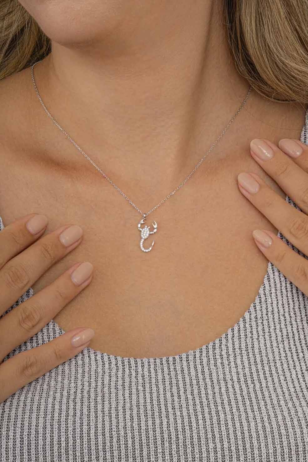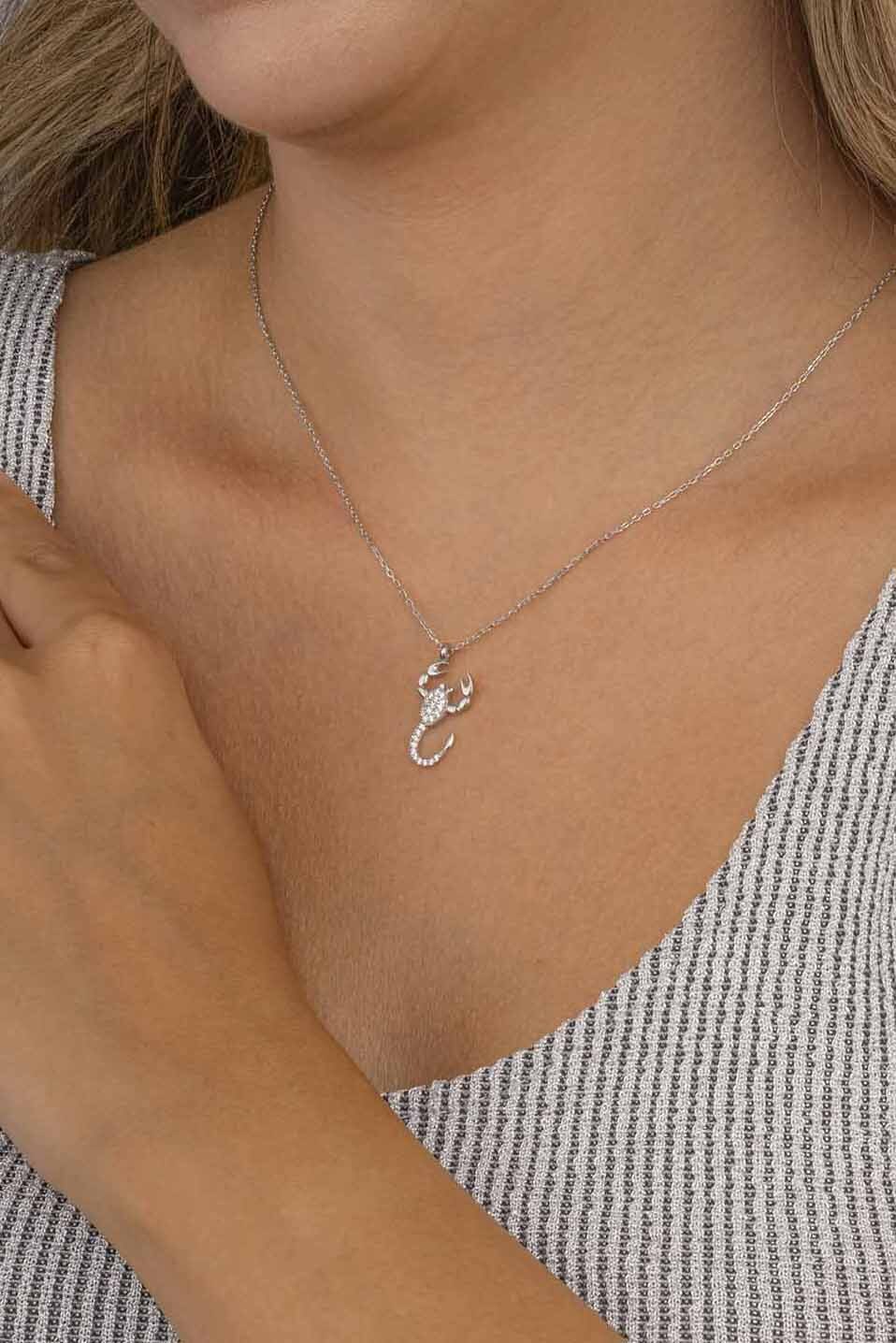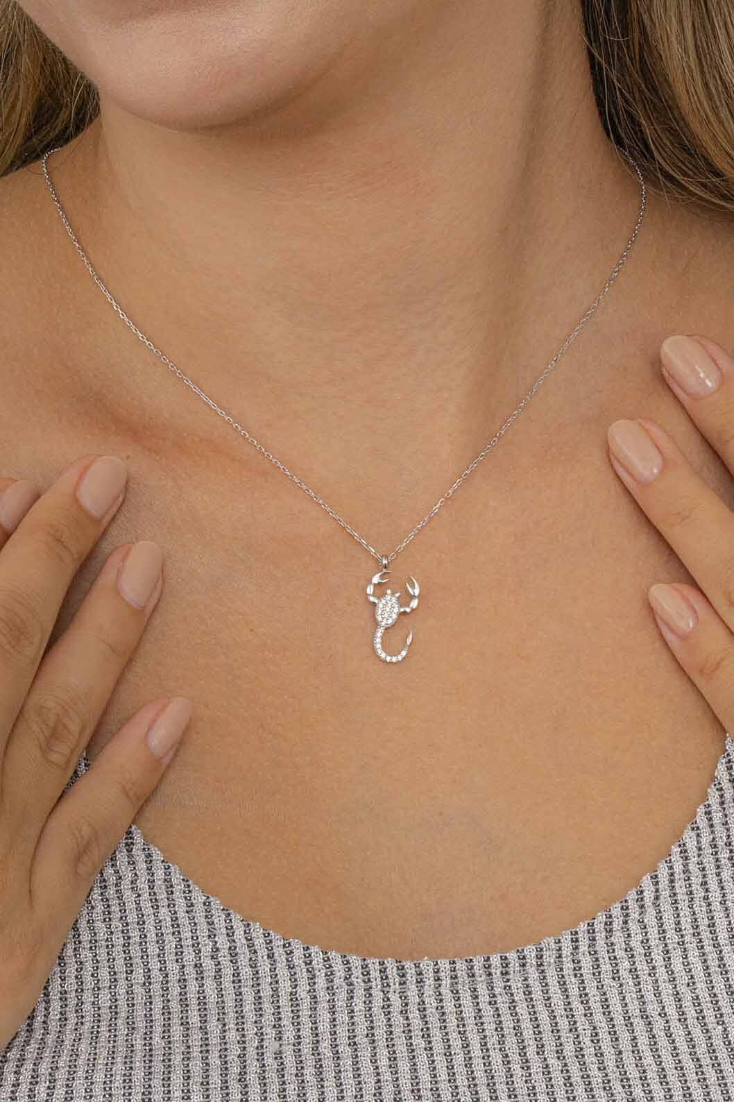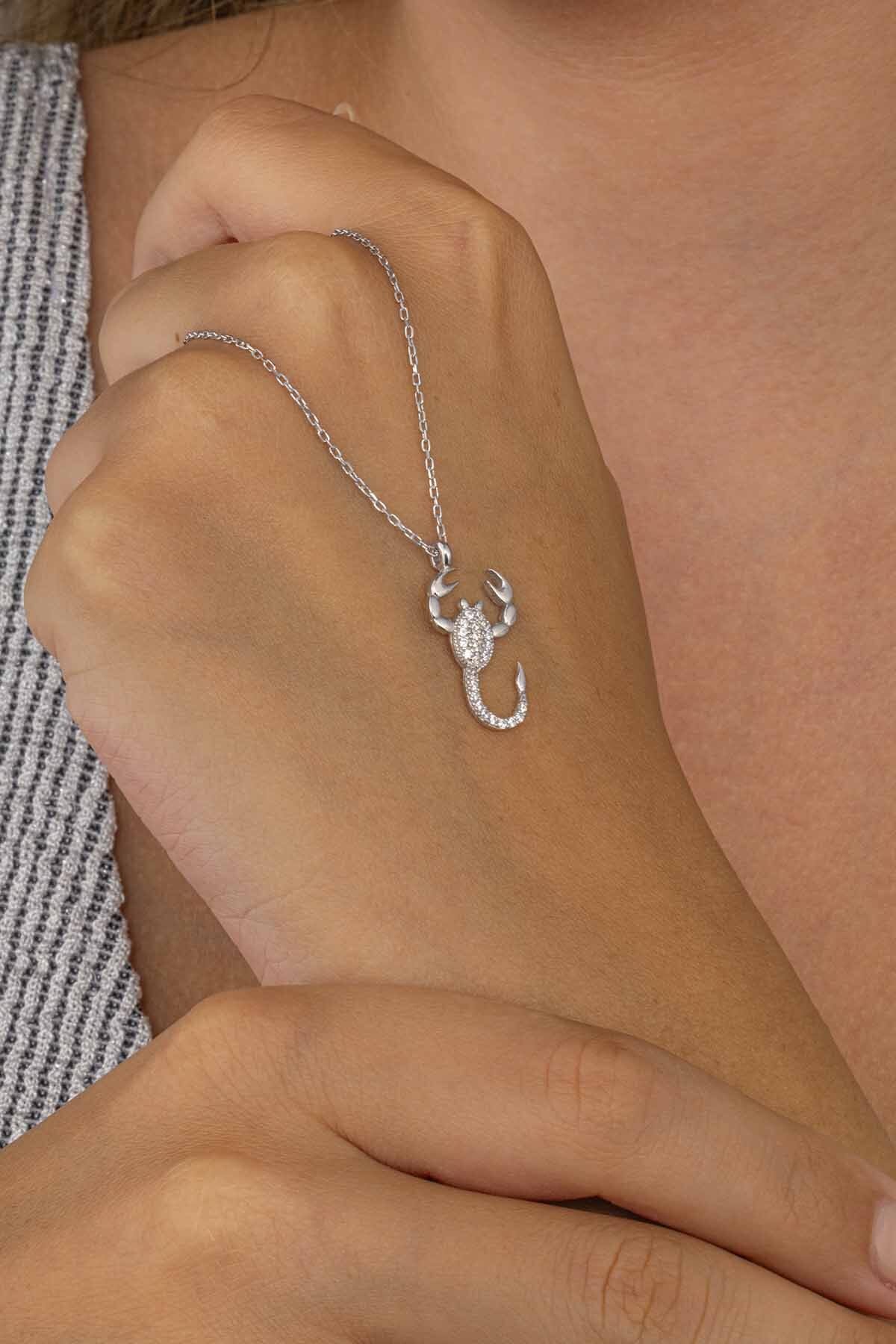 Tutkunun ve güçlü iradenin sembolü Akrep burcunu taşıyan bu zarif gümüş kolye, parlayan beyaz taşlarıyla hem burcun ruhunu hem de şıklığı yansıtır.