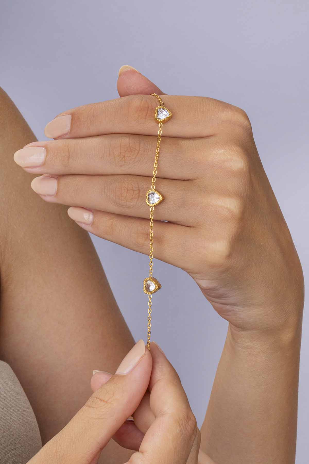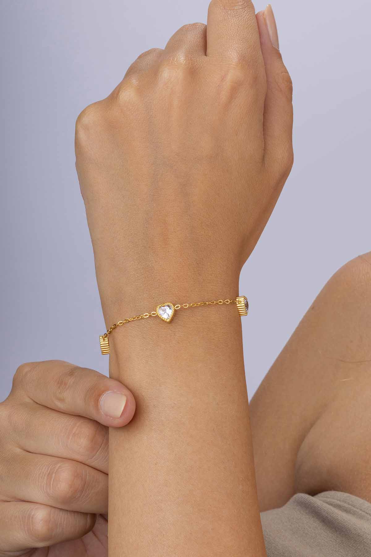 “Beyaz taşlı kalp geçişli altın kaplama çelik bileklik, zarif ve romantik tasarımıyla kararma yapmaz, günlük ve özel günlerde şıklığınızı tamamlar.”