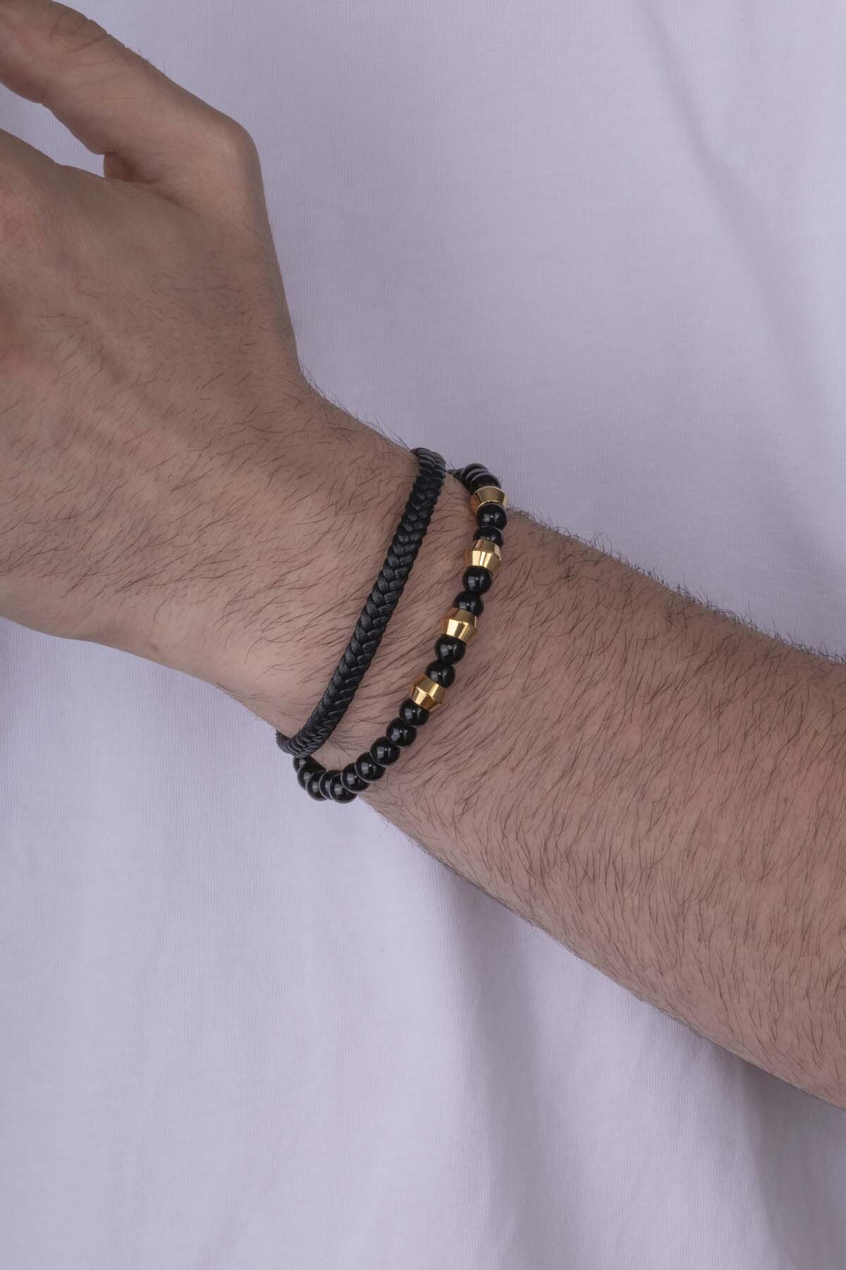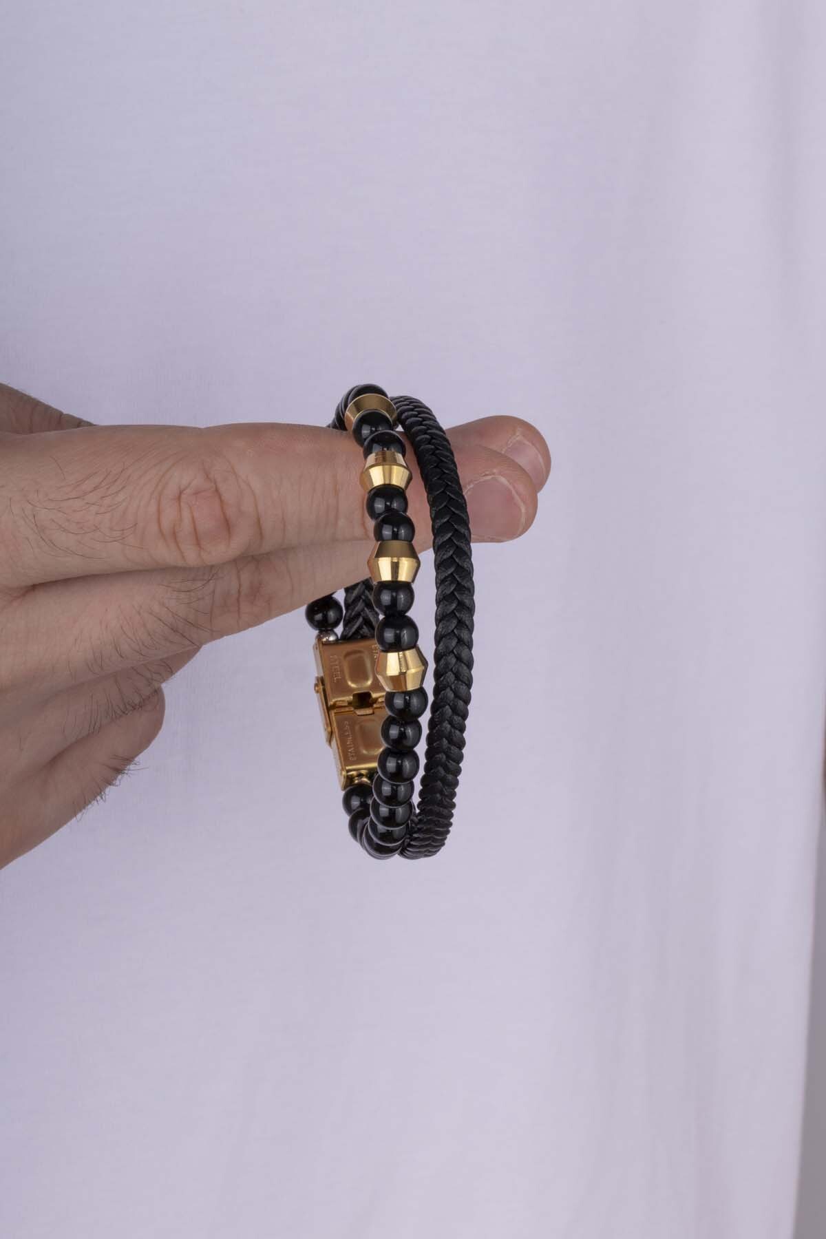 Çelik Aparatlı Oniks Taşlı Çift Sıra Erkek Deri Bileklik - 2