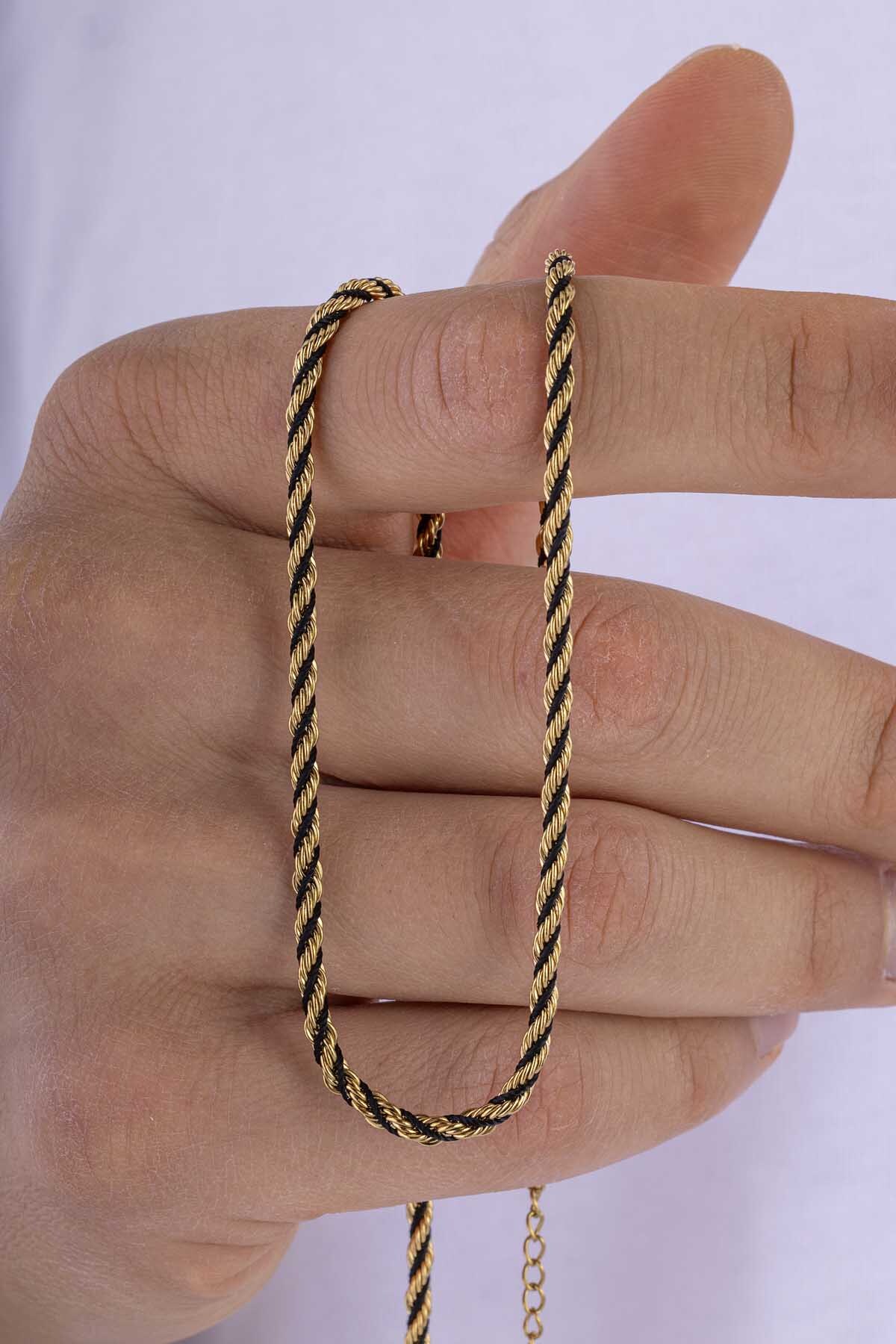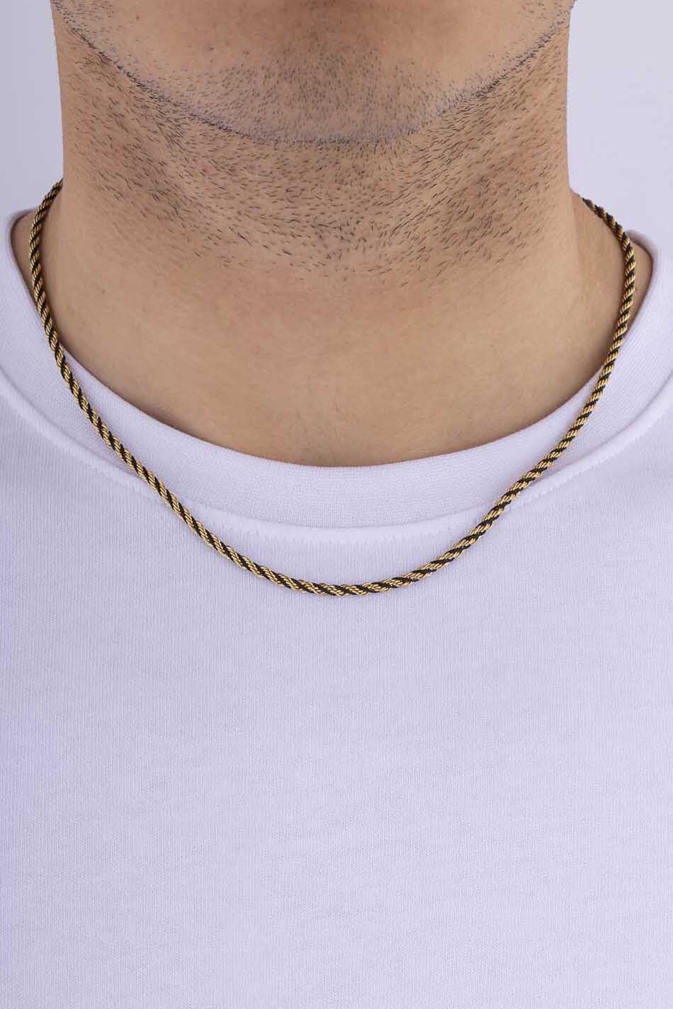 Spiral burgu formundaki örgü yapısı, zincire hem hacim hem de dinamik bir hareket kazandırır. Siyah ve altın tonlarının güçlü kontrastı, ürüne şık bir derinlik ve modern bir dokunuş ekler. Üst segment paslanmaz çelik gövde üzerine uygulanan altın kaplama teknoloji, uzun süreli kullanımda parlaklığın korunmasına yardımcı olur. Ter, su ve günlük kullanımdan kaynaklanan temaslara karşı dirençli yapısıyla uzun ömürlü bir performans sunar.