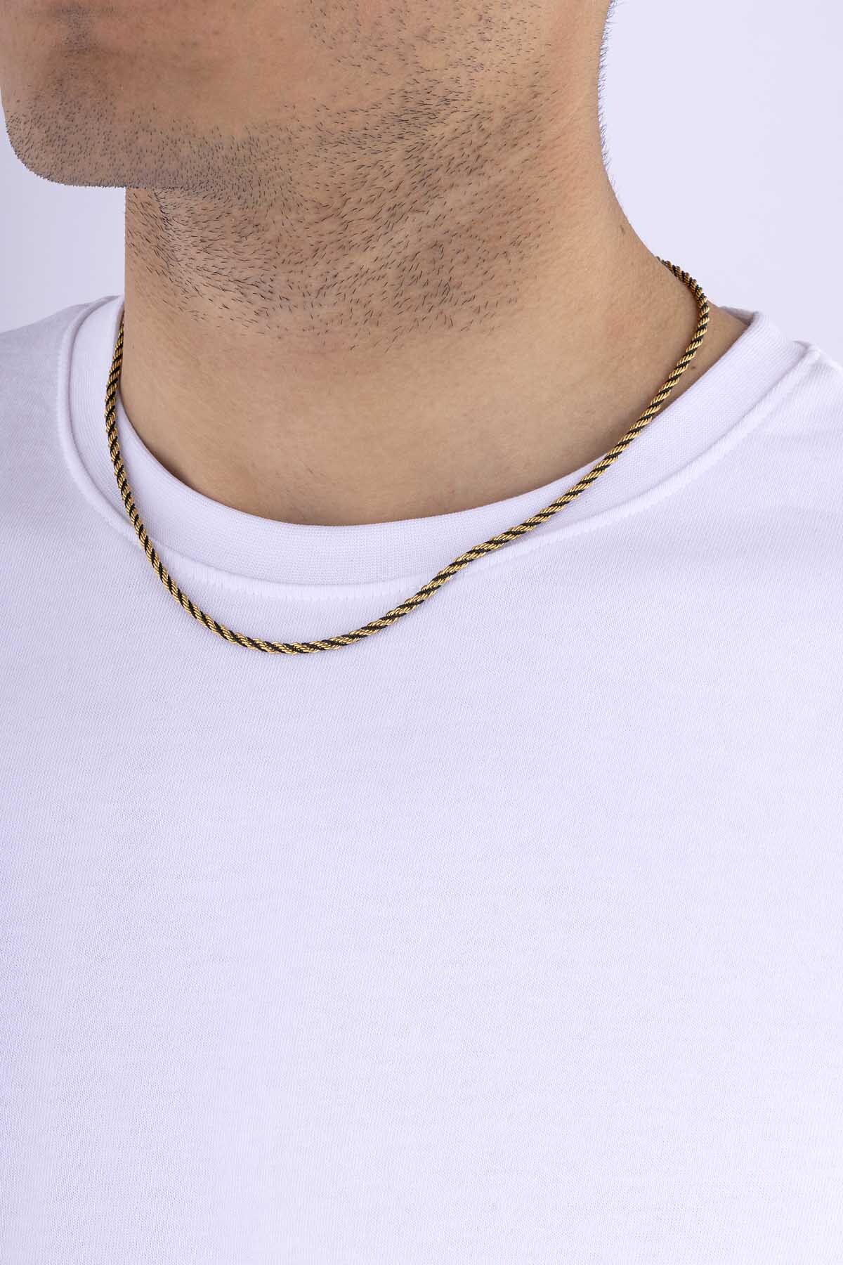Siyah detaylarla zenginleştirilmiş, altın kaplama yüzeye sahip çift renkli modern çelik erkek zincir modeli.