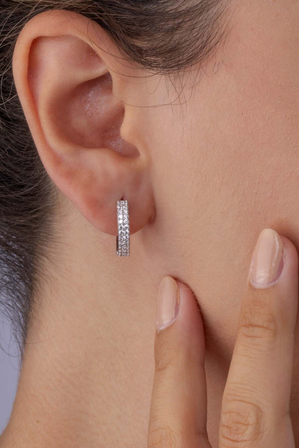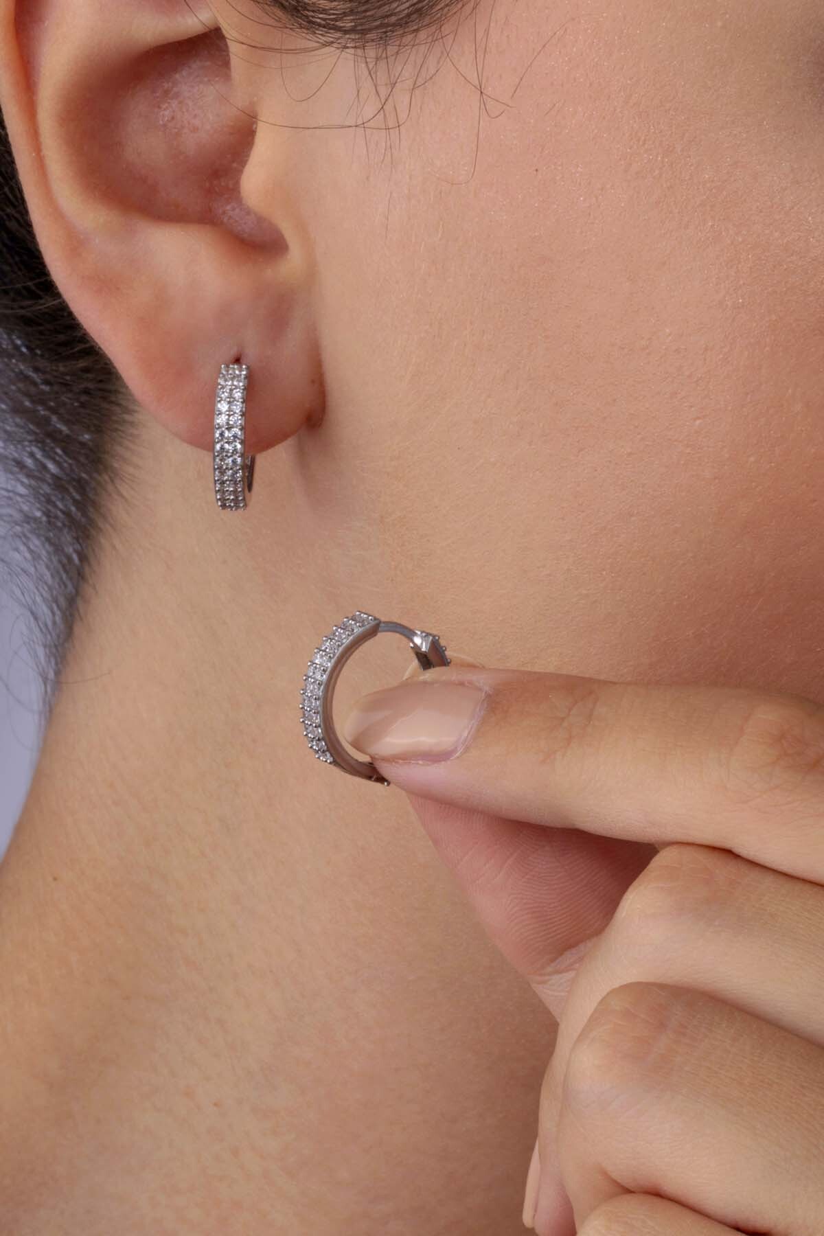 Zarafeti ve ışıltıyı bir arada sunan çift sıra taşlı tamtur küpe modeli, günlük stilinizden özel davetlere kadar her ortamda kusursuz bir tamamlayıcıdır. Modern tasarımıyla dikkat çekerken, 925 ayar gümüşün dayanıklılığı ve beyaz altın kaplamanın şıklığı sayesinde uzun yıllar severek kullanılabilecek bir aksesuardır. Parlak taş detaylarıyla ışığı her açıdan yansıtan bu küpe, kulaklarınızda göz kamaştırıcı bir ışıltı yaratır.