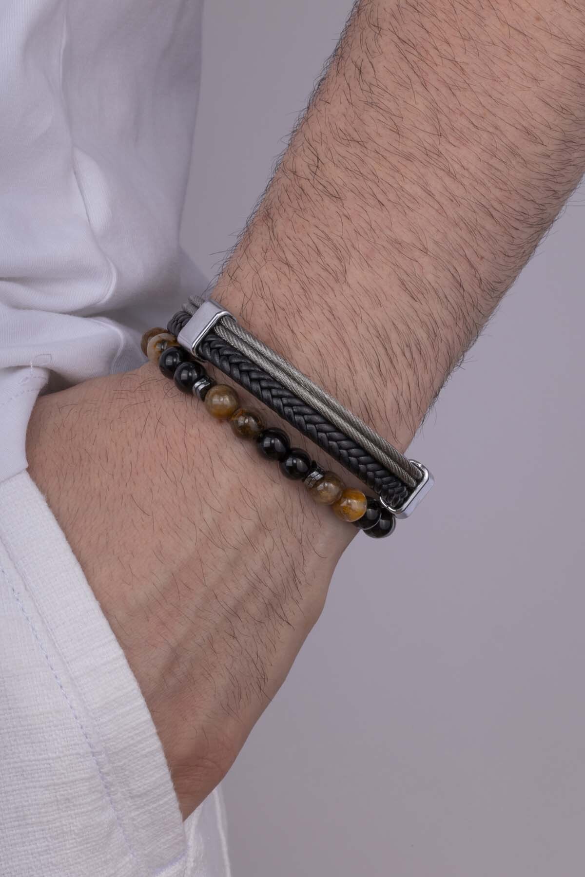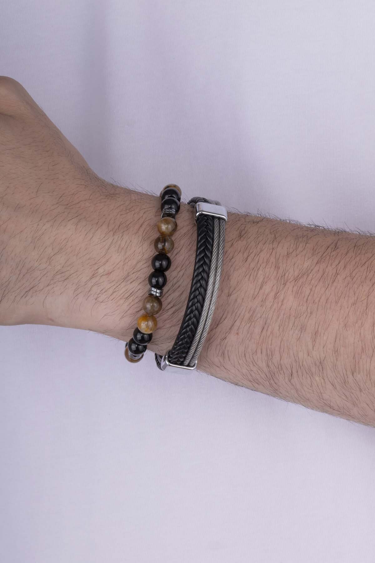 Damarlı Akik Doğal Taş Örgü Model Çİft Sıra Deri Erkek Bileklik Kombini - 2