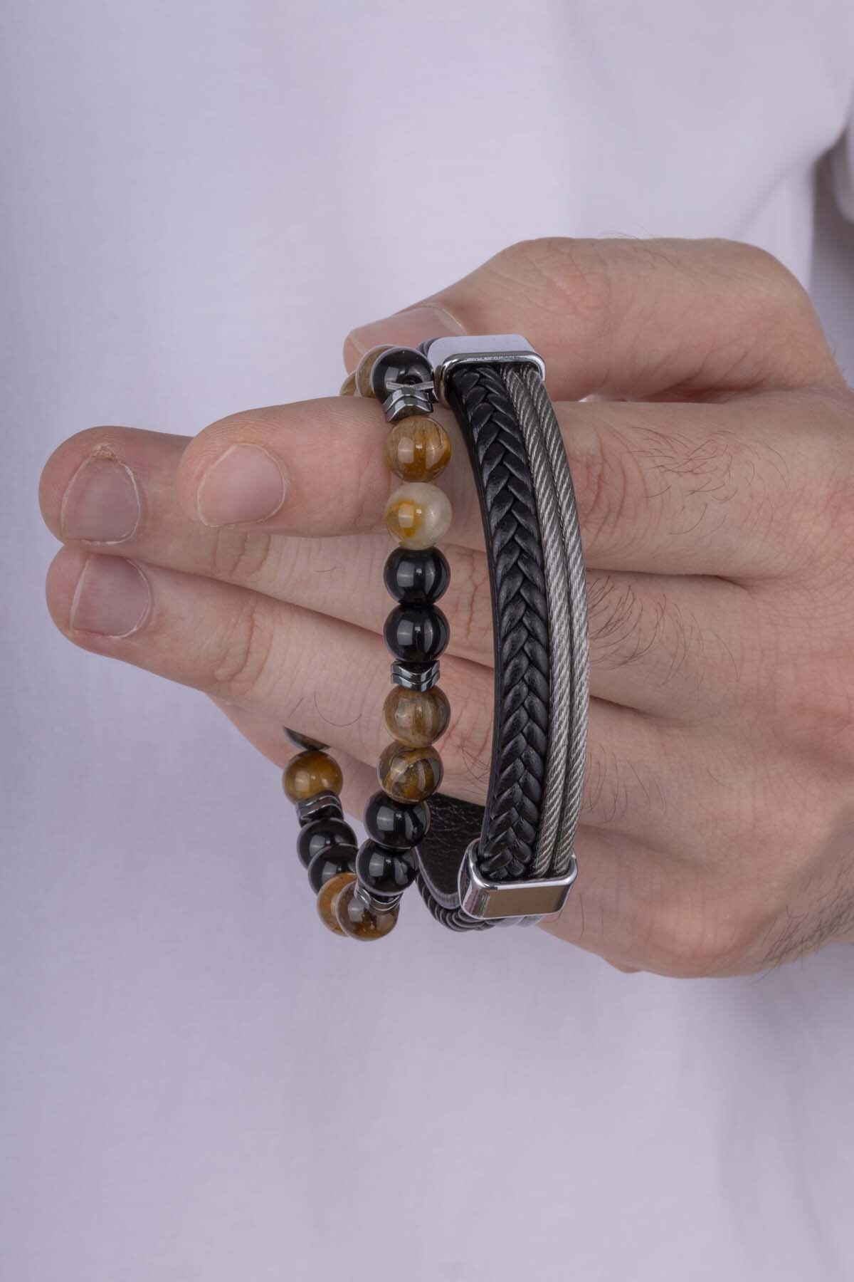 Damarlı akik taşı ve örgü deri şıklığını bir arada sunan bu özel kombin, güçlü ve modern duruşunuzun tamamlayıcısı olacak.