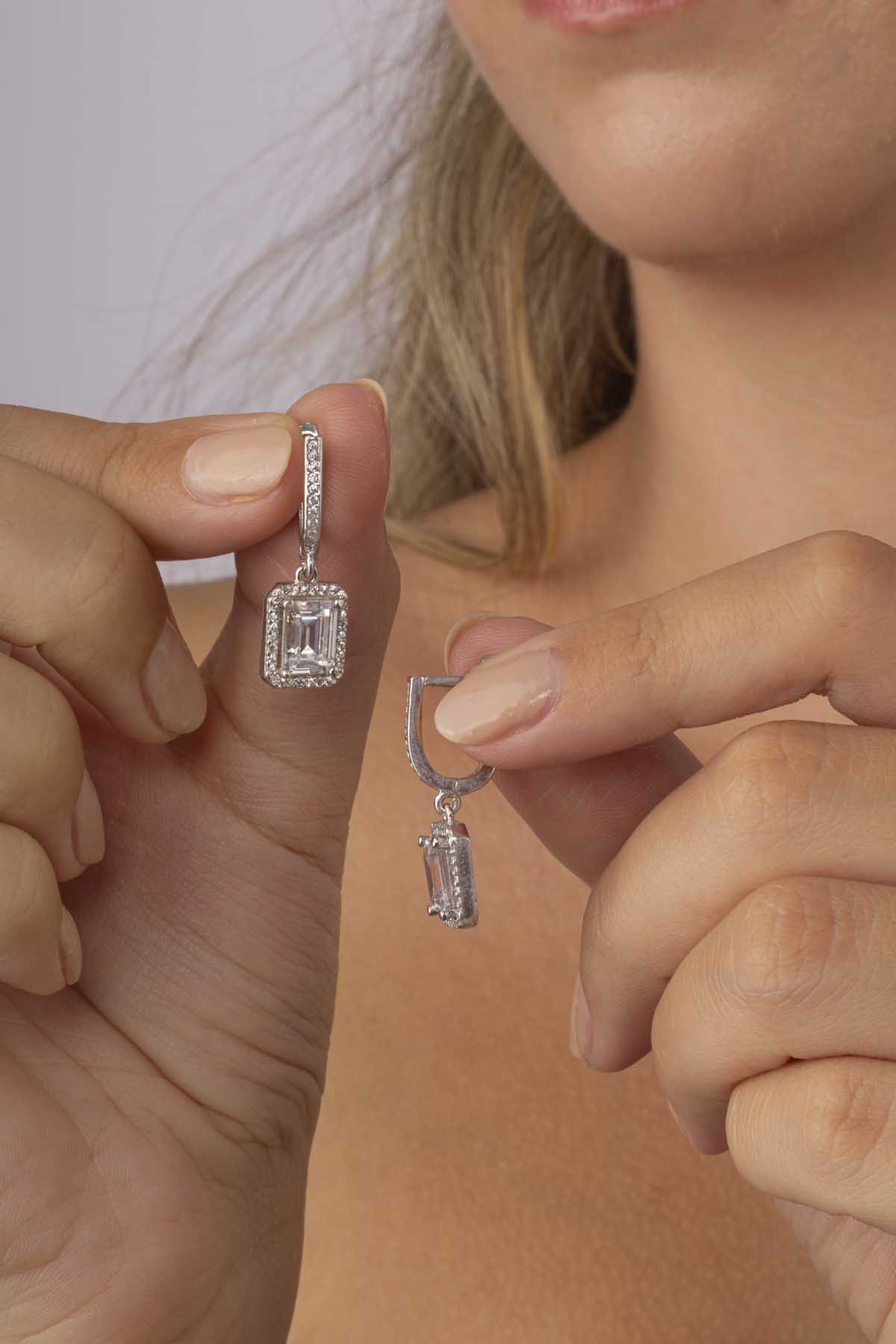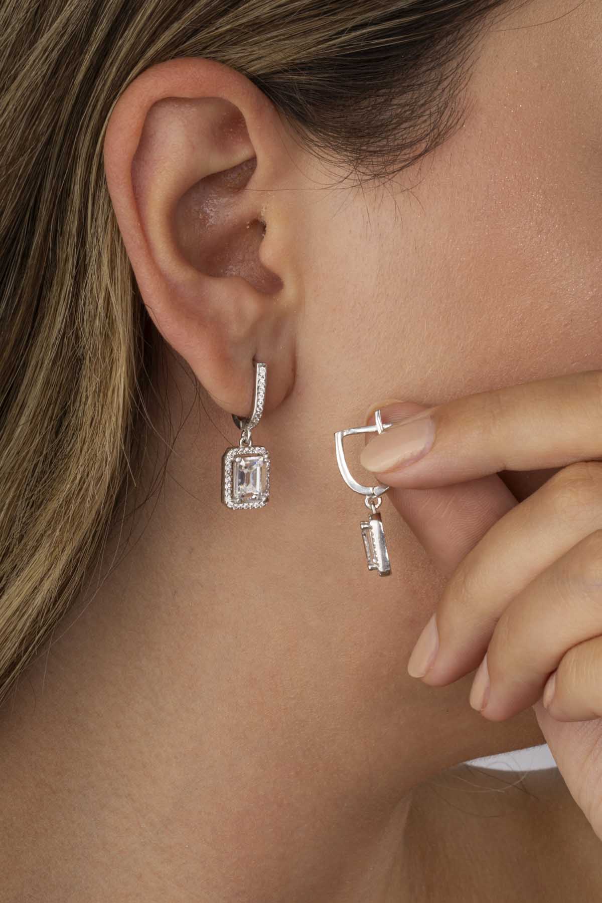 Dikdörtgen Taşlı Baget Taşlı Gümüş Küpe - 3
