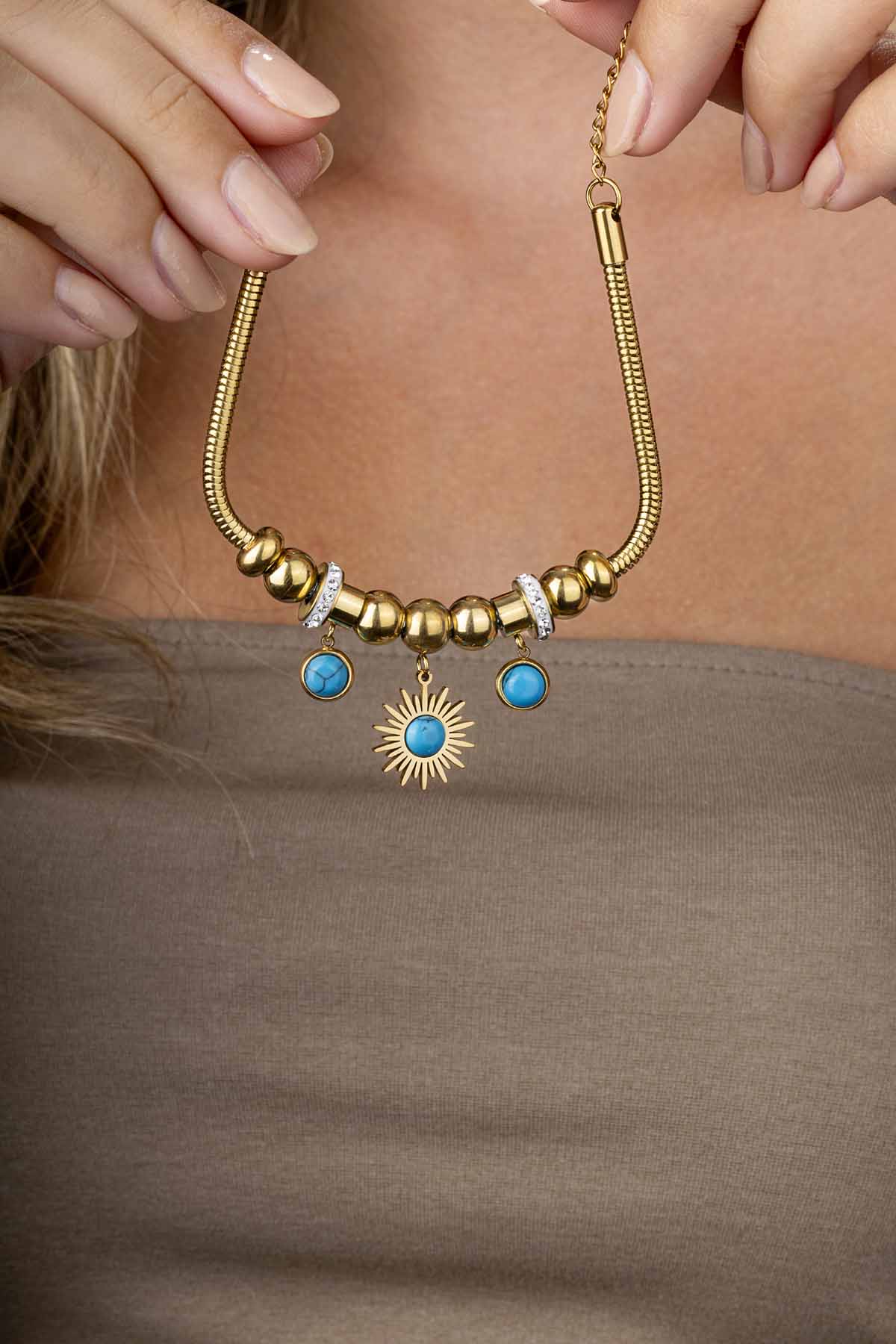 Canlı firuze taşları ve güneşin enerjisini taşıyan zarif tasarımıyla stilinizi aydınlatacak özel bir aksesuarla şıklığınızı tamamlayın.