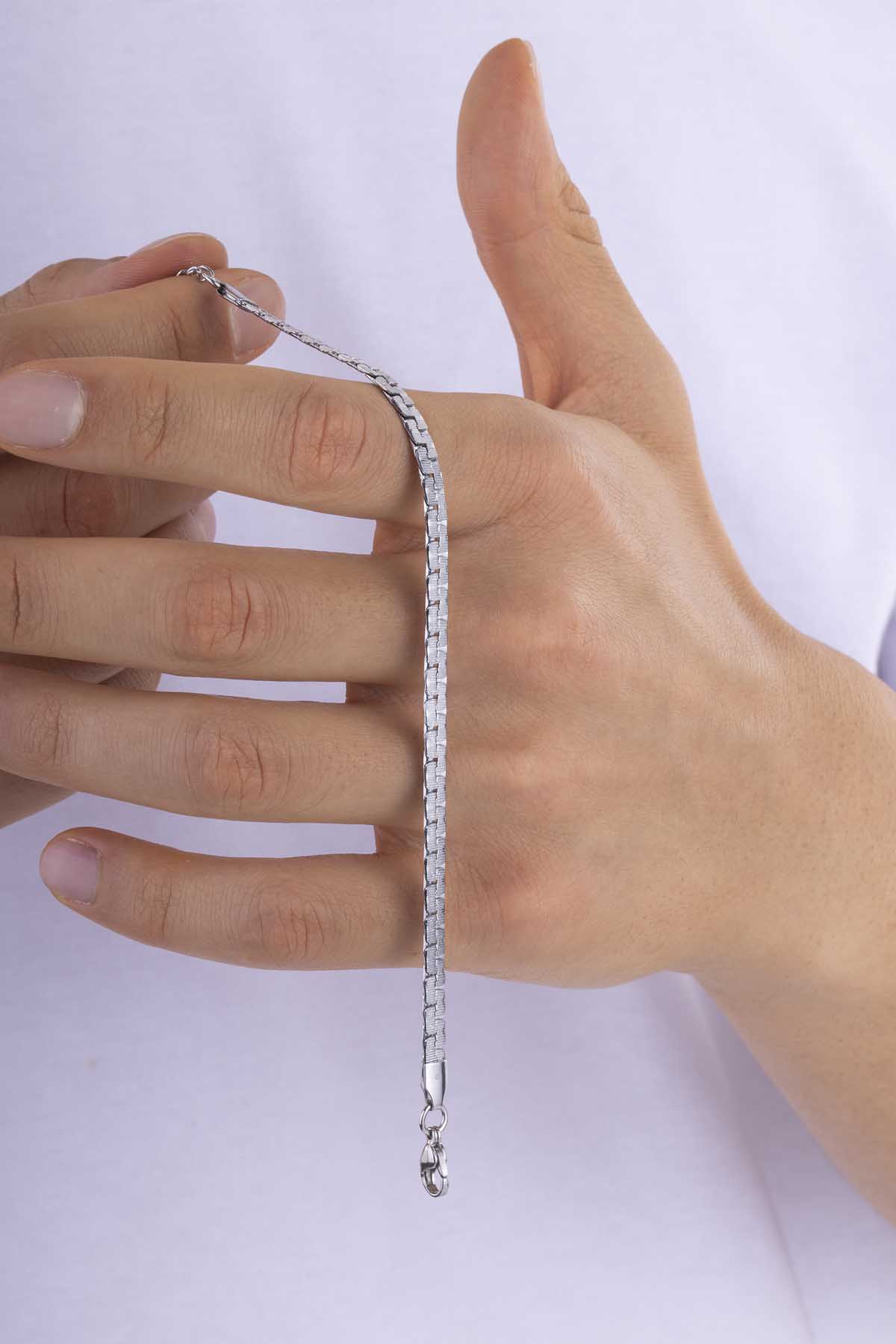 Geçmeli kare zincir formuyla tasarlanan bu çelik erkek bileklik, modern ve net hatlarıyla minimal şıklık sunar.