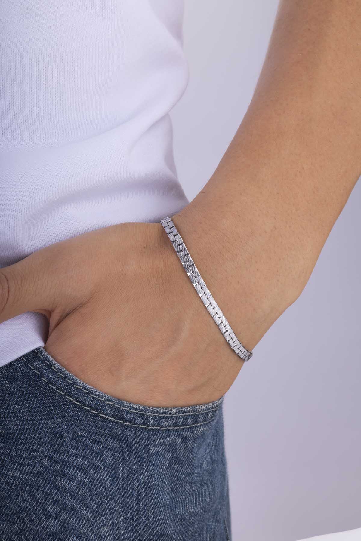 Paslanmaz çelik malzemesi sayesinde kararma yapmayan, uzun ömürlü kullanım sunan ve dayanıklılığıyla bilinen bu model, ergonomik yapısıyla konforlu bir bilek hissi oluşturur. Hafifliği ile kullanım sırasında rahatsızlık vermez. Tasarımındaki modern hatlar, bilekliği minimalist stilin güçlü bir temsilcisi haline getirir.