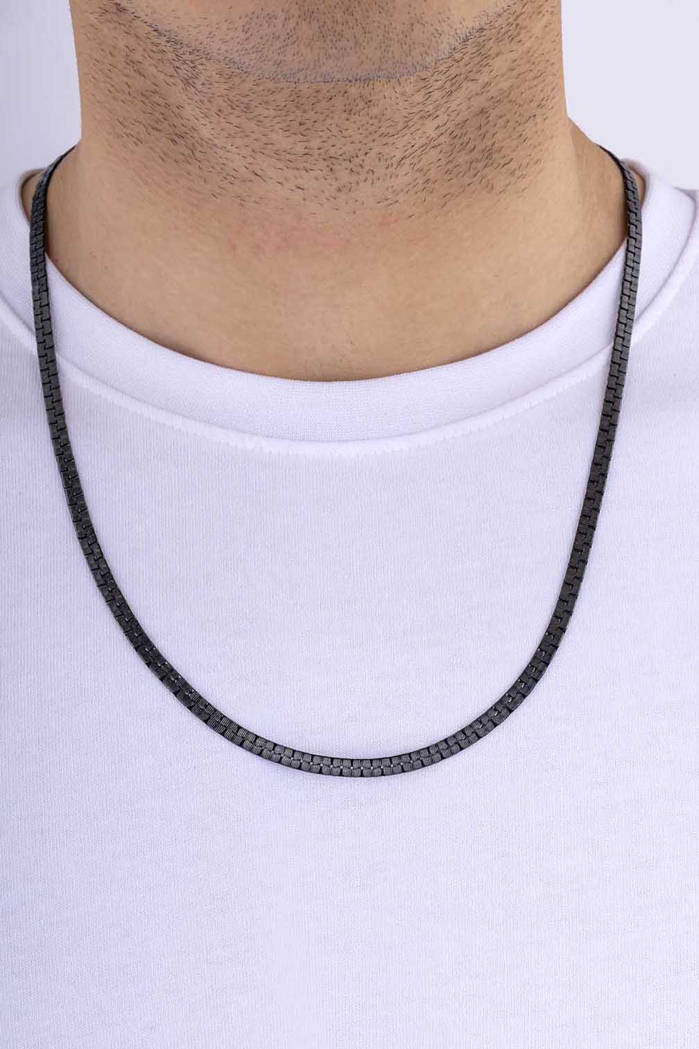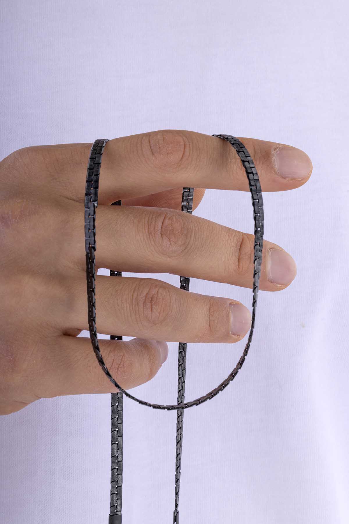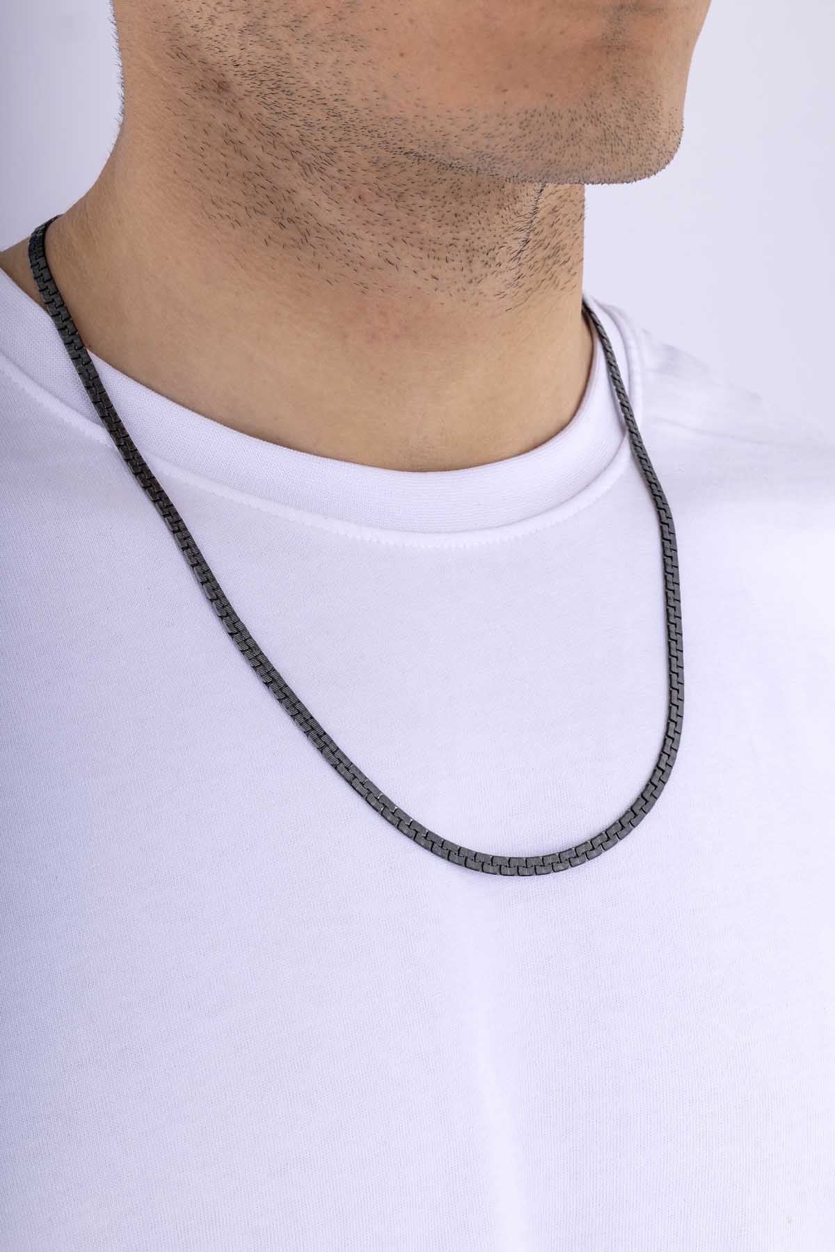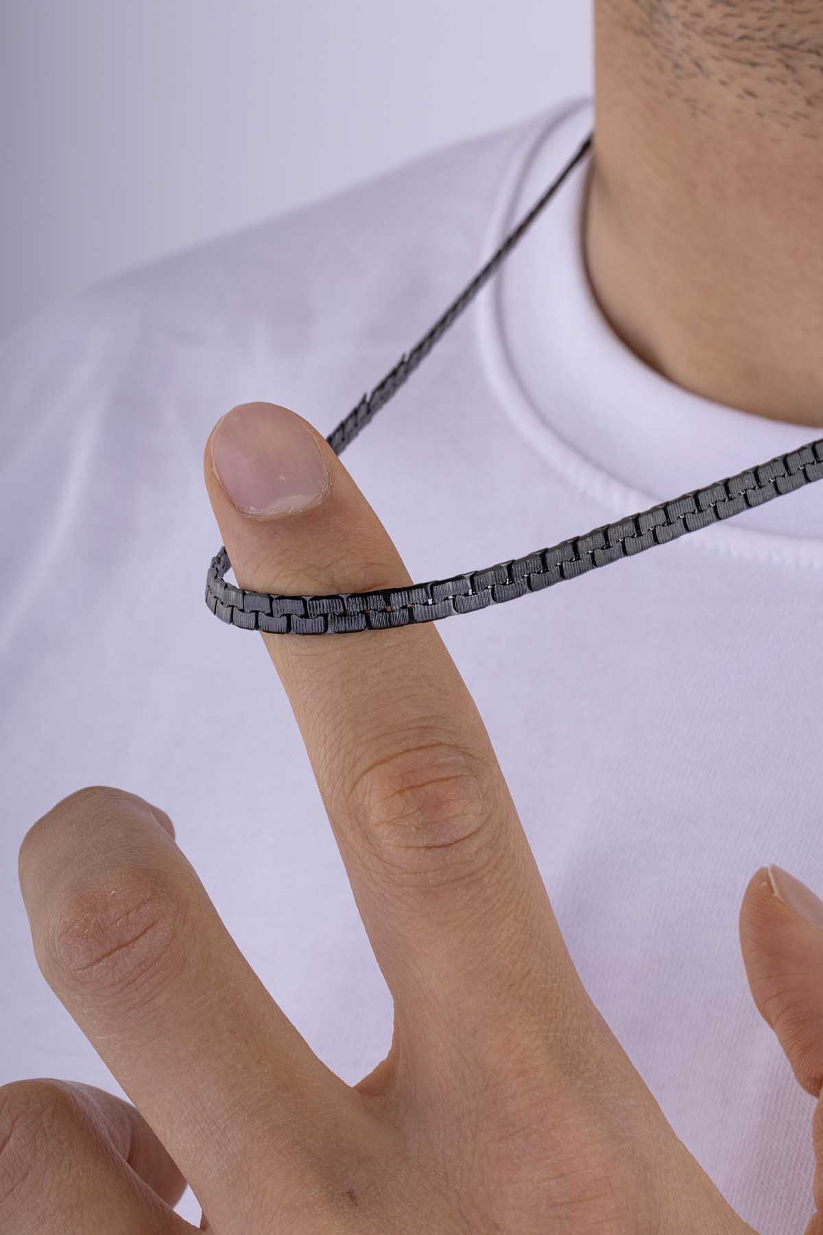 Geçmeli mekanizmaya sahip kare formda tasarlanmış siyah çelik erkek zincir, modern ve güçlü duruşuyla günlük ve özel kullanıma uygun bir aksesuardır.