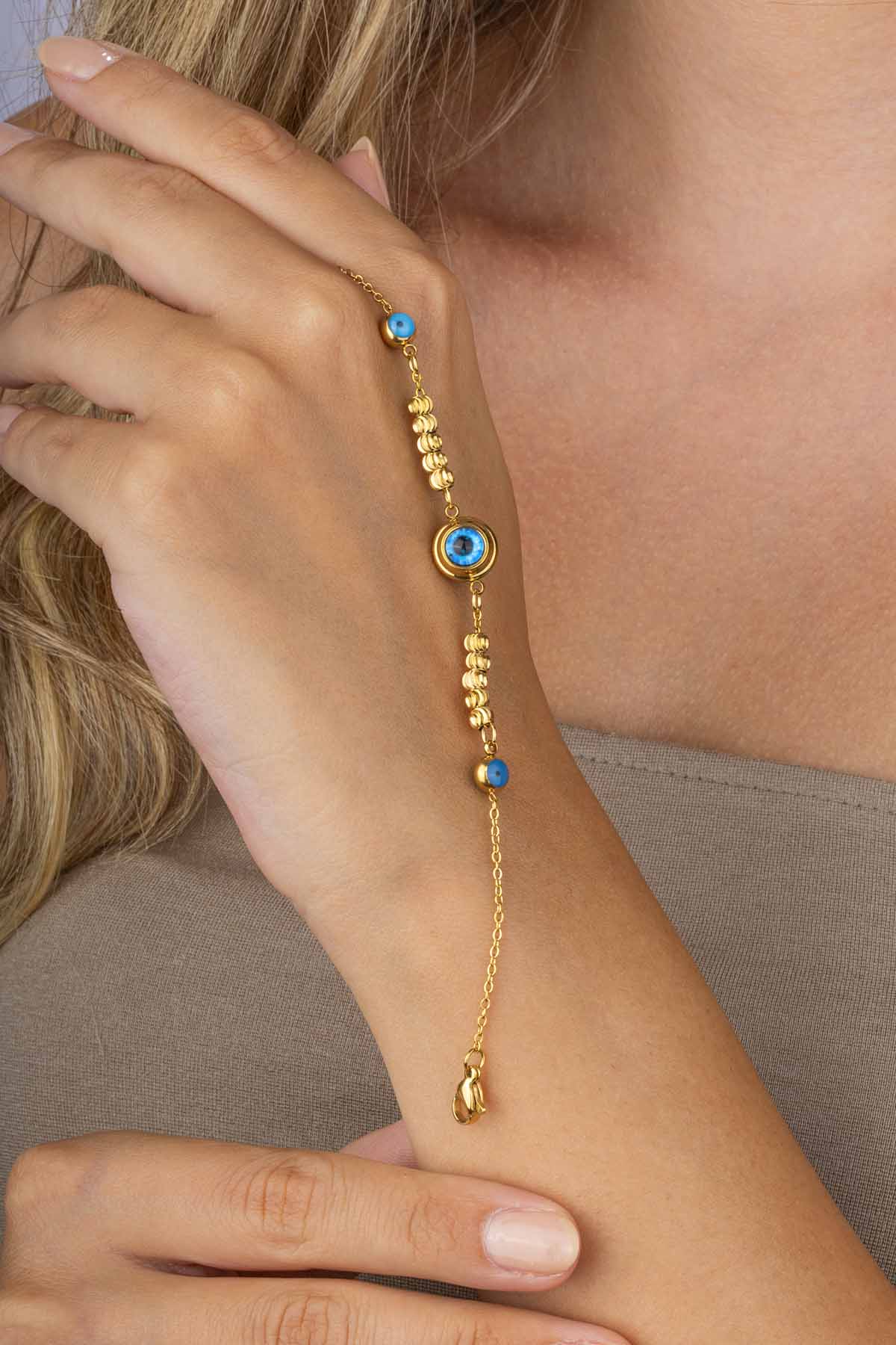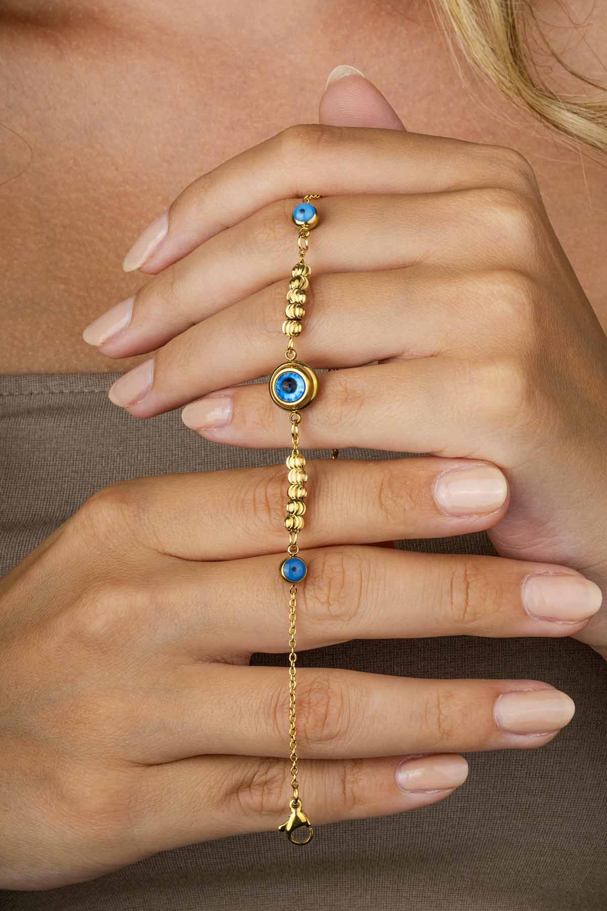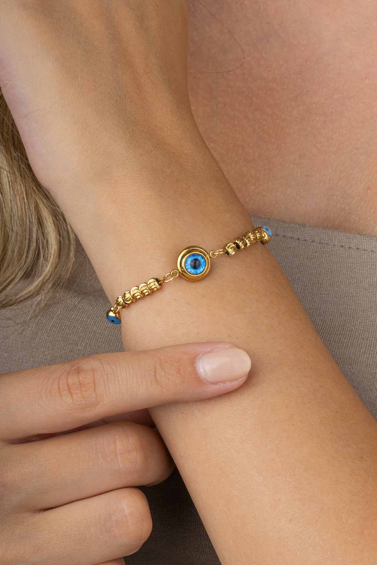 Paslanmaz çelikten üretilmiş ve altın kaplama ile tamamlanmış bu bileklik, kararma ve çizilmelere karşı dayanıklı yapısıyla uzun ömürlüdür. Parlak altın kaplama yüzeyi, göz figürünün mavi tonlarıyla birleşerek göz alıcı bir kontrast oluşturur. Günlük hayatta sade kombinlere ışıltı katar, özel günlerde ise anlamlı bir aksesuar olarak tercih edilebilir.
