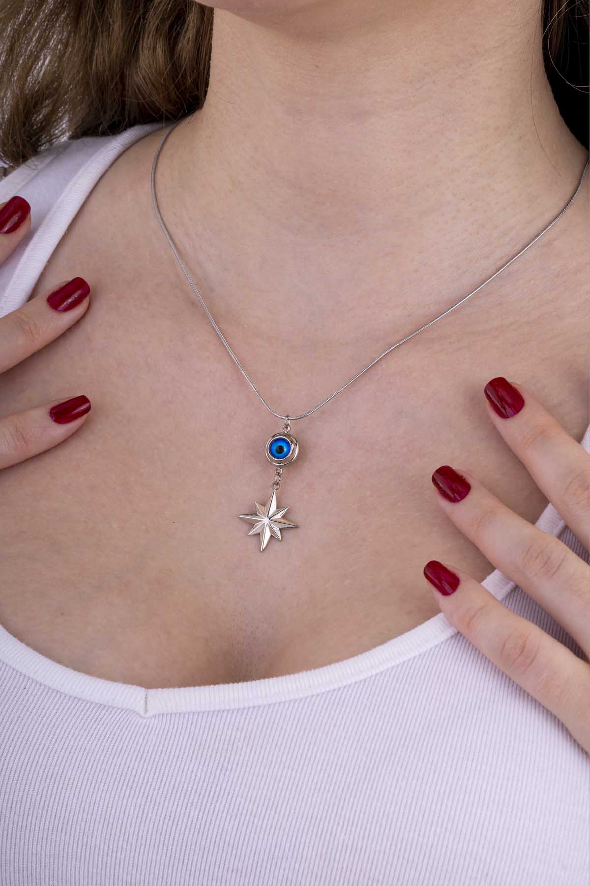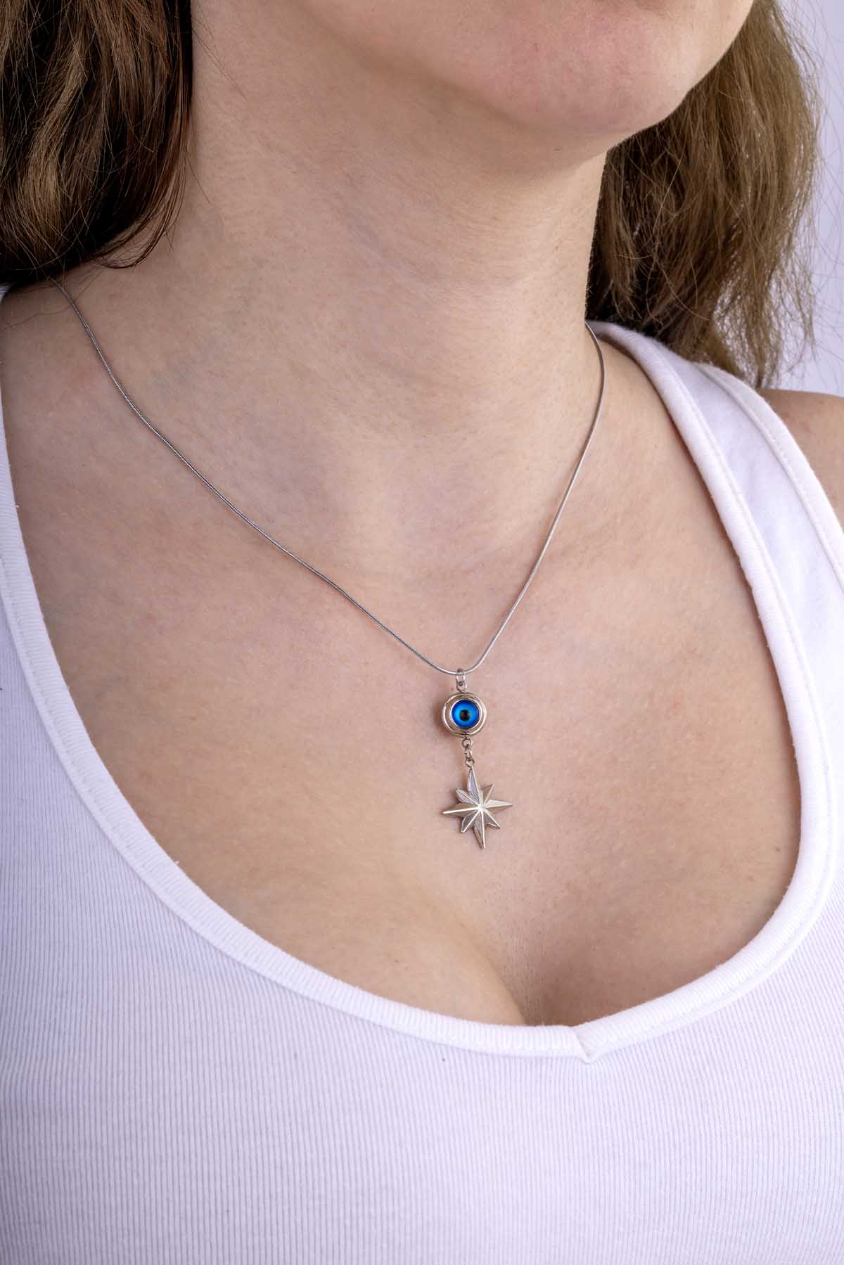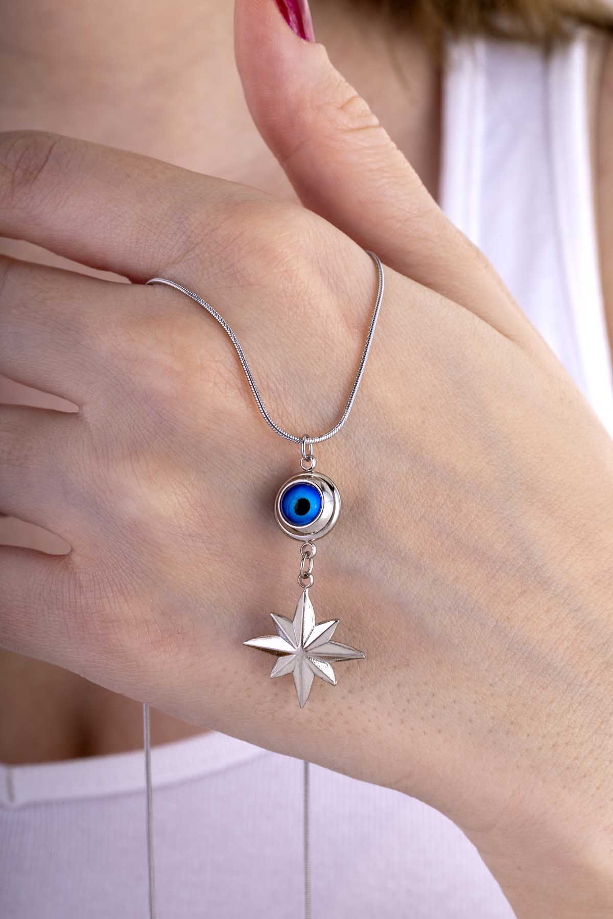 Göz motifi ve kutup yıldızı charm detayıyla tasarlanan çelik kadın kolye; modern, anlamlı ve etkileyici bir stil sunan şık bir aksesuardır.