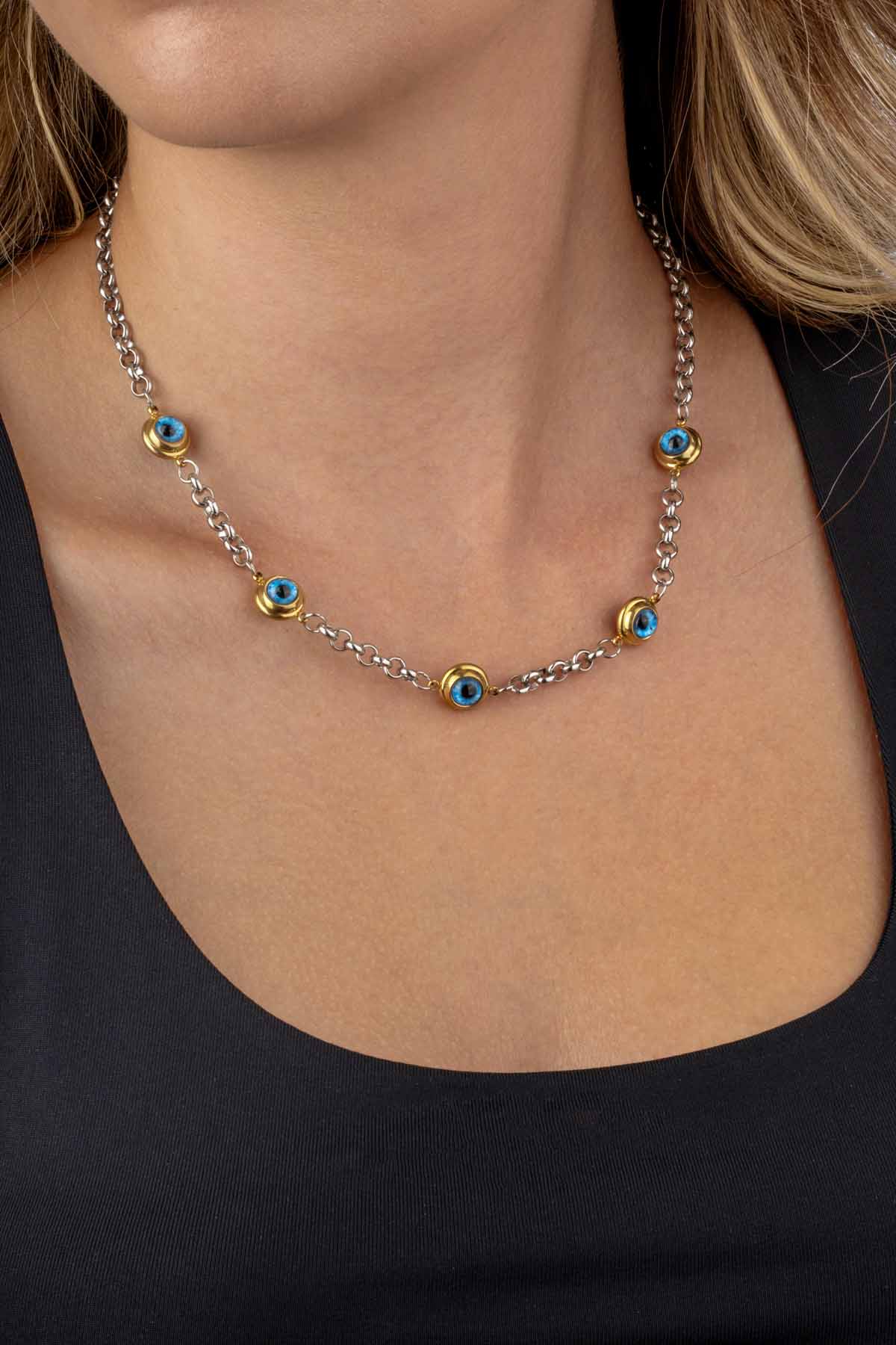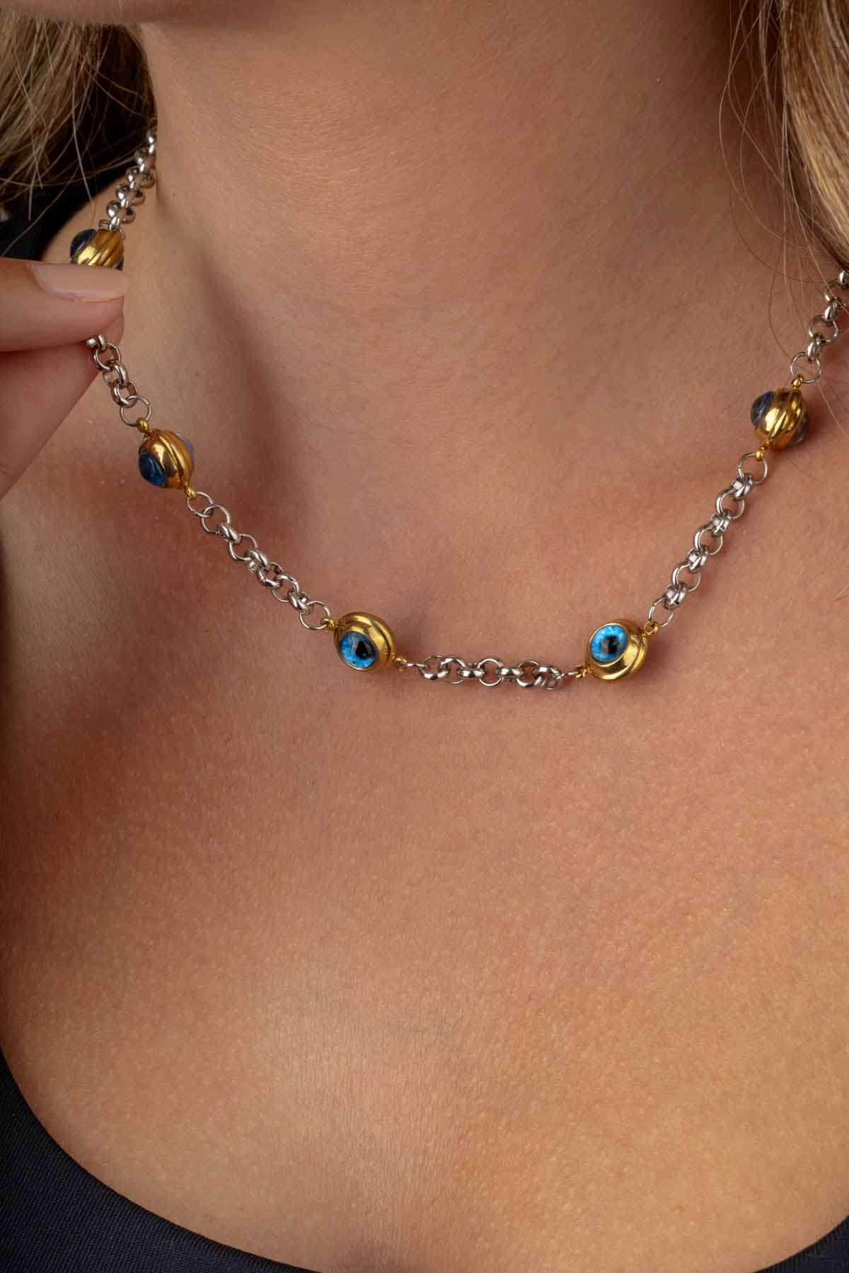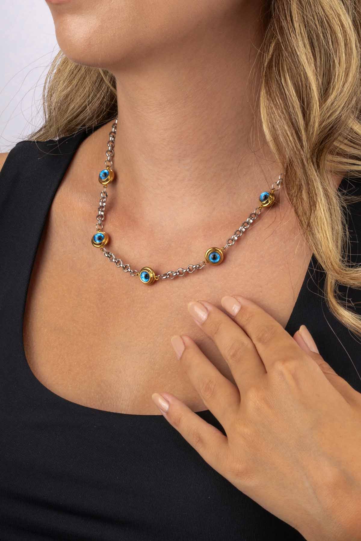 Göz Motifli Zincir Model Kadın Çelik Kolye, şıklığıyla dikkat çekerken aynı zamanda koruyucu anlamıyla da öne çıkar. Mavi göz figürleri, zincir boyunca eşit aralıklarla dizilerek modern ve göz alıcı bir görünüm yaratır. Altın kaplama detaylarla zenginleştirilen paslanmaz çelik yapısı sayesinde uzun ömürlü ve dayanıklıdır.