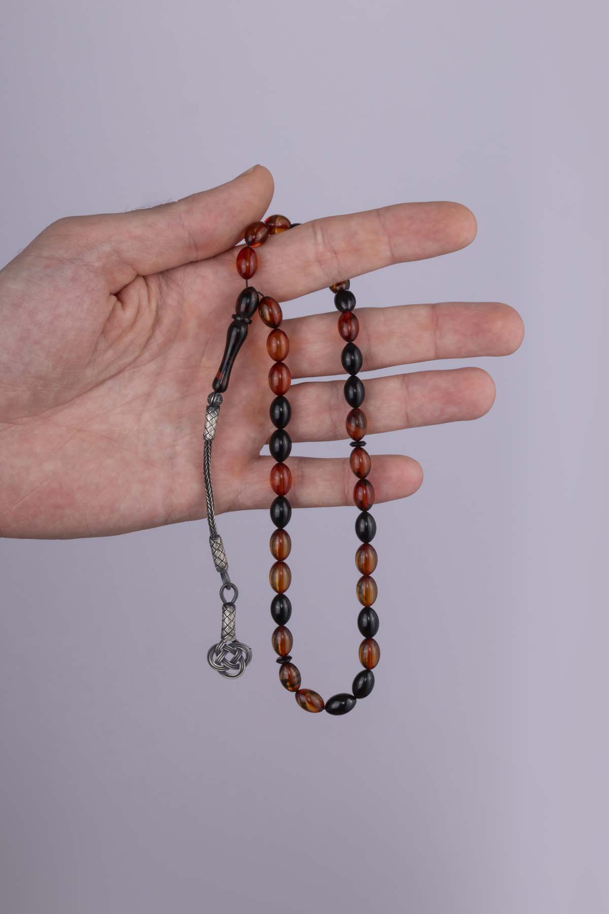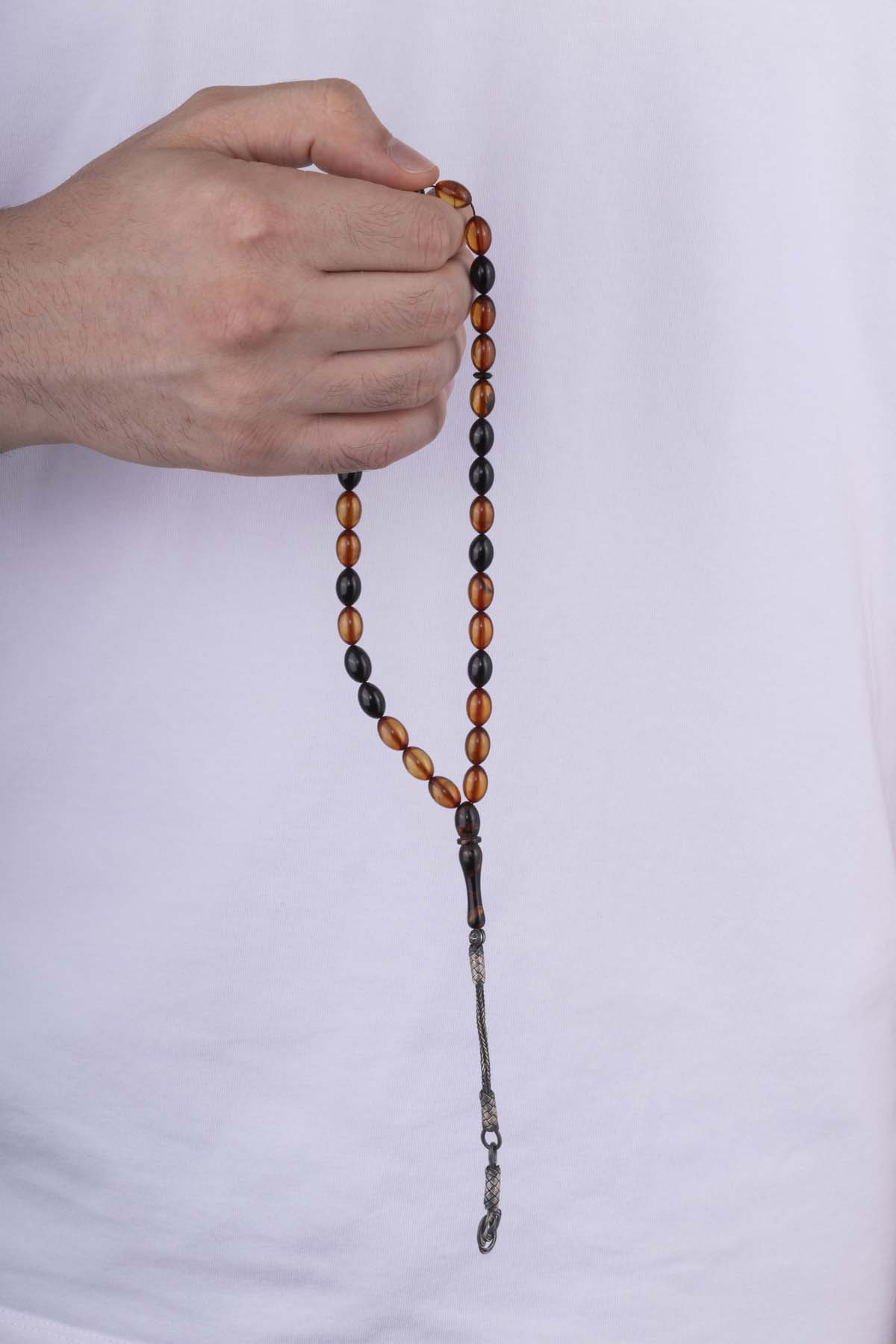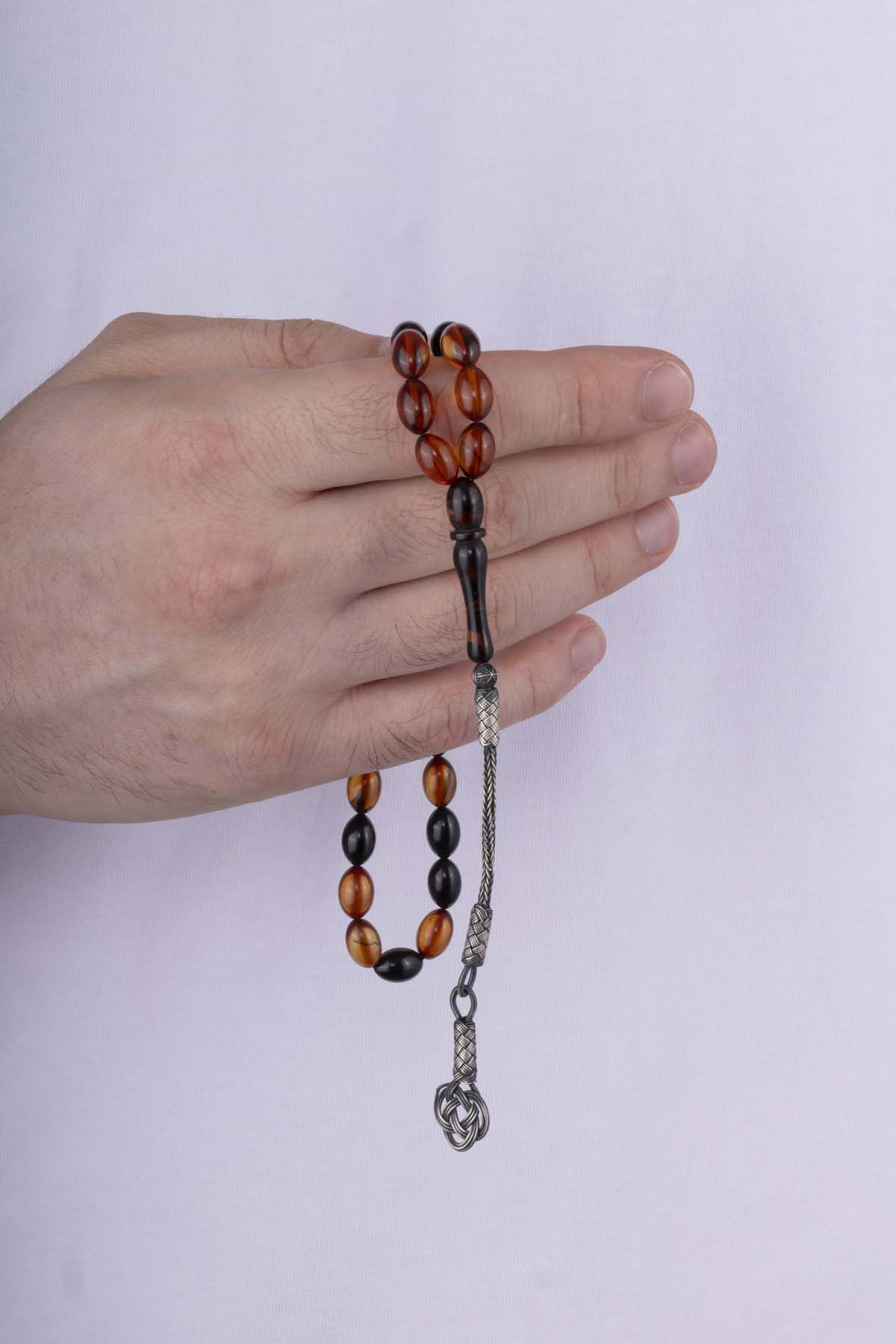 Gümüş Kazaz Püsküllü Beyzi Kesim Çift Renk Kehribar Tesbih - 4