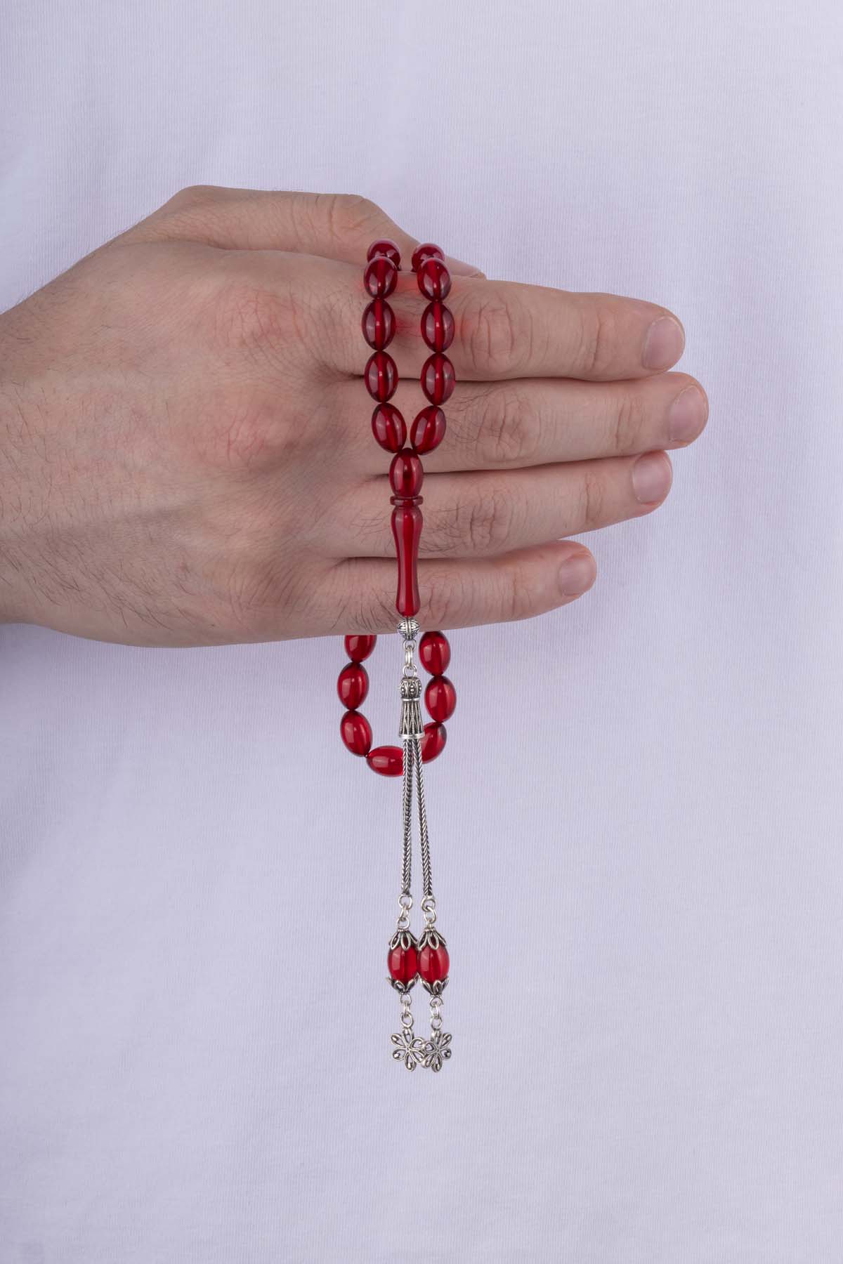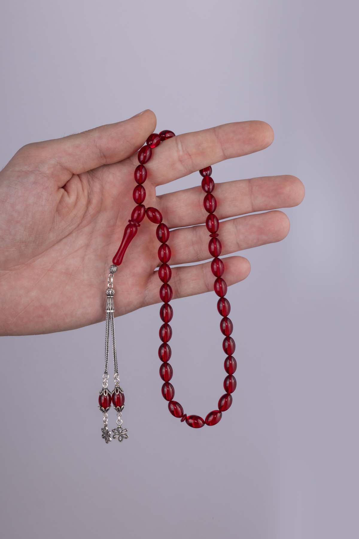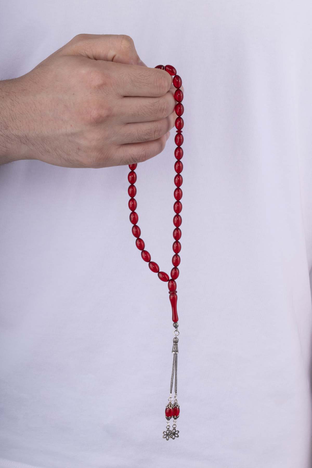 Gümüş Püsküllü Ateş Kehribar Tesbih Kırmızı Taşlı - 4