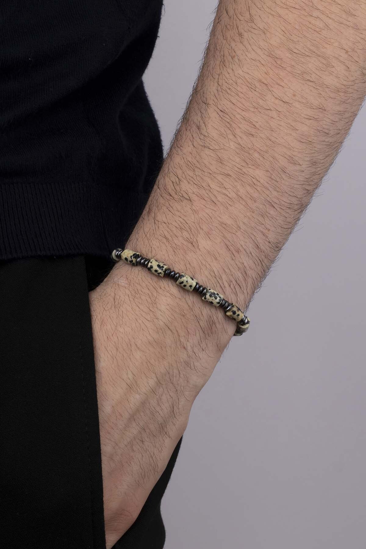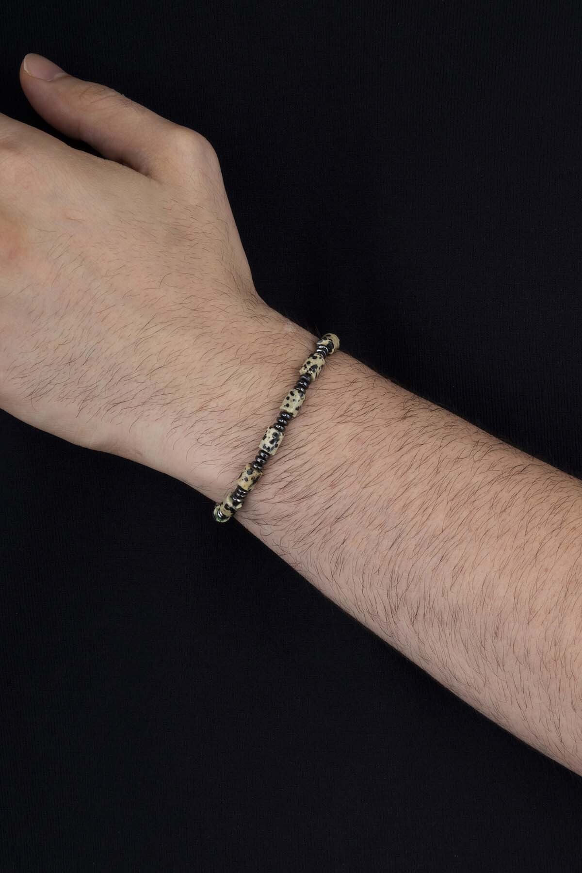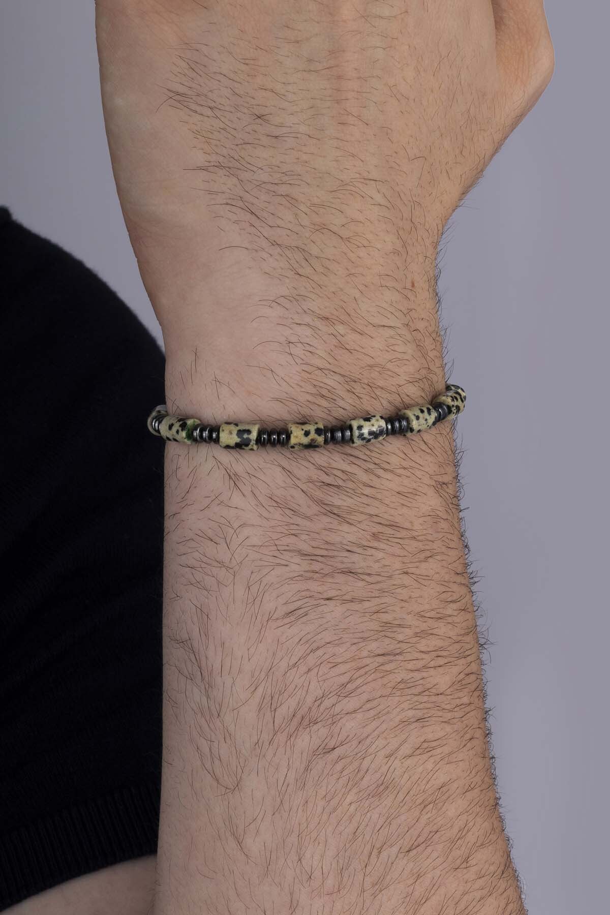 Hematit geçişli silindir kesim benekli doğal taş erkek bileklik, özgün deseni ve dikkat çekici yapısıyla farklı bir stil arayanlar için özel olarak tasarlanmıştır. Benekli doğal taşların doğal görünümü, hematit taşlarının parlak geçişleriyle birleşerek modern ve şık bir kontrast oluşturur. Elastik ip yapısı sayesinde bileğe kolayca uyum sağlar ve günlük kullanımlar için idealdir.