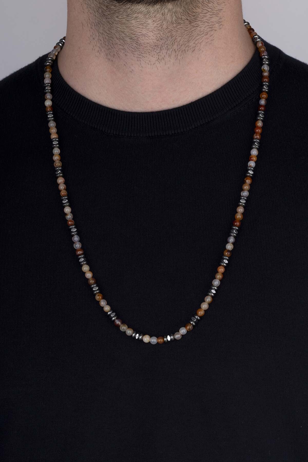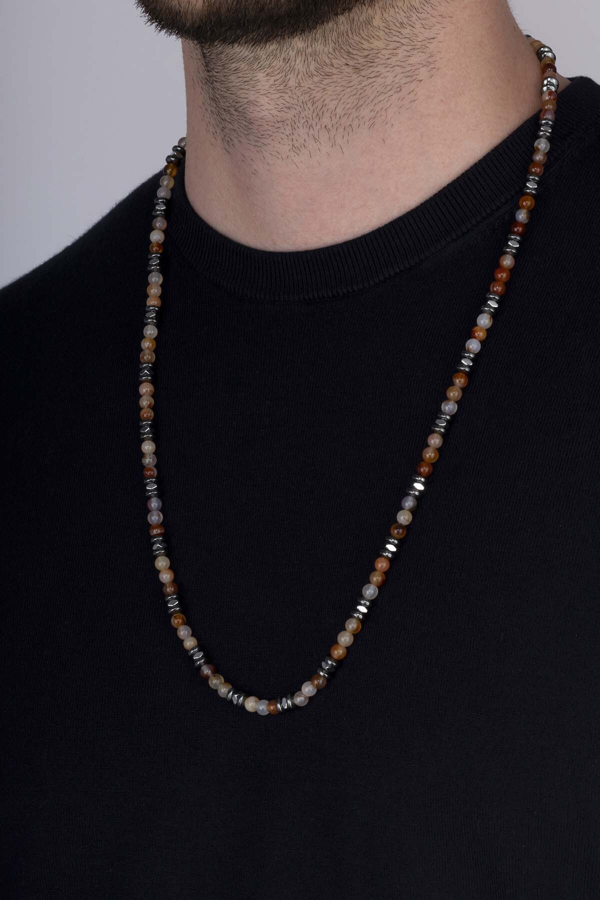 Hematit ve akik taşının enerjik uyumunu taşıyan bu kolye, şıklığınızla birlikte enerjinizi de yükselterek tarzınıza maskülen bir dokunuş katar.