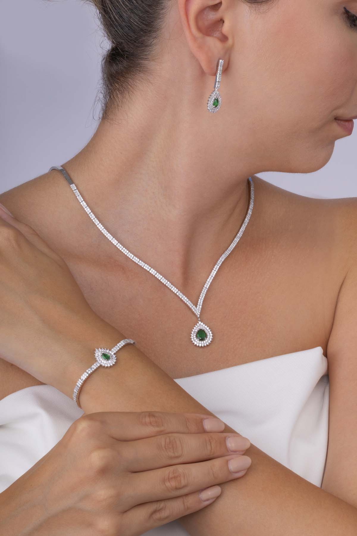 925 ayar gümüşten üretilen bu göz alıcı set; kolye, küpe ve bileklikten oluşur. Her bir parçada, merkezde yer alan zümrüt tonlarında damla kesim taş yer almakta ve bu taşların etrafı, ışığı mükemmel yansıtan parlak zirkonlarla zarifçe çevrelenmiştir. Su yolu dizilimiyle tamamlanan bu tasarım, göz alıcı bir ışıltı ve dengeli bir görünüm sunar.
